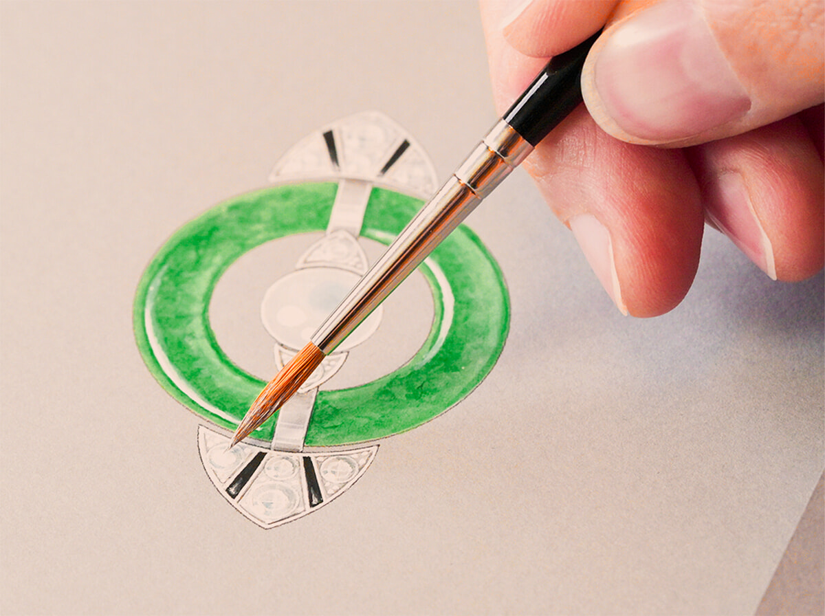 ふたつめは実技の「ハイジュエリーのグアッシュ3:素材」。1点ものであるハイジュエリーの制作過程では、グアッシュと呼ばれる精巧なデザイン画が職人に渡される。メタルと貴石が織りなす光と色をどう表現するかを学んだこれまでのグアッシュ2講座に加え、新講座では素材にフォーカス。アールデコスタイルのブローチをテーマに、翡翠、真珠、オニキス、ダイヤモンドをあしらったデザイン画を仕上げていく。