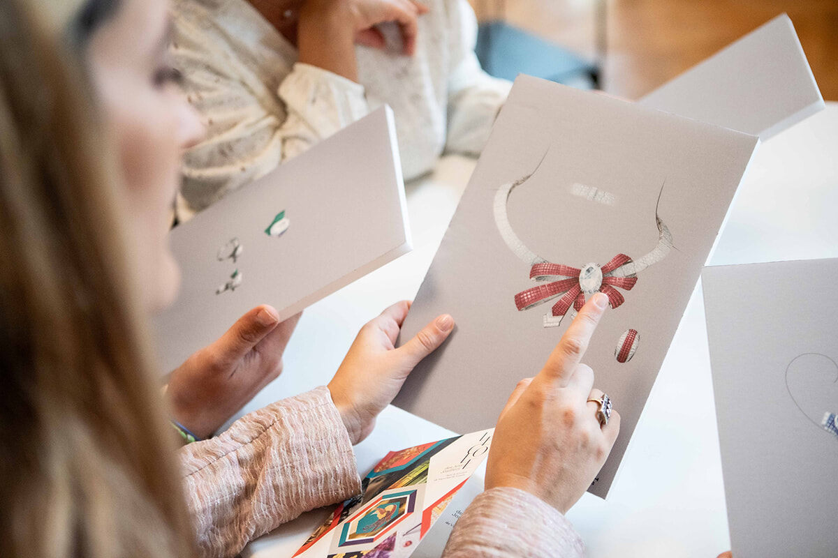 「レソト レジェンド:ダイヤモンド原石からハイジュエリーコレクションへ」より。「レジェンド オブ ダイヤモンド」コレクションに姿を変えたダイヤモンドたちをグアッシュで確認。© Pauline de Courrèges