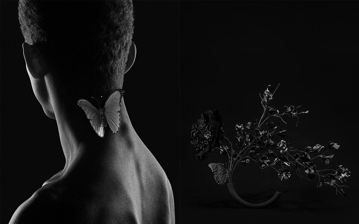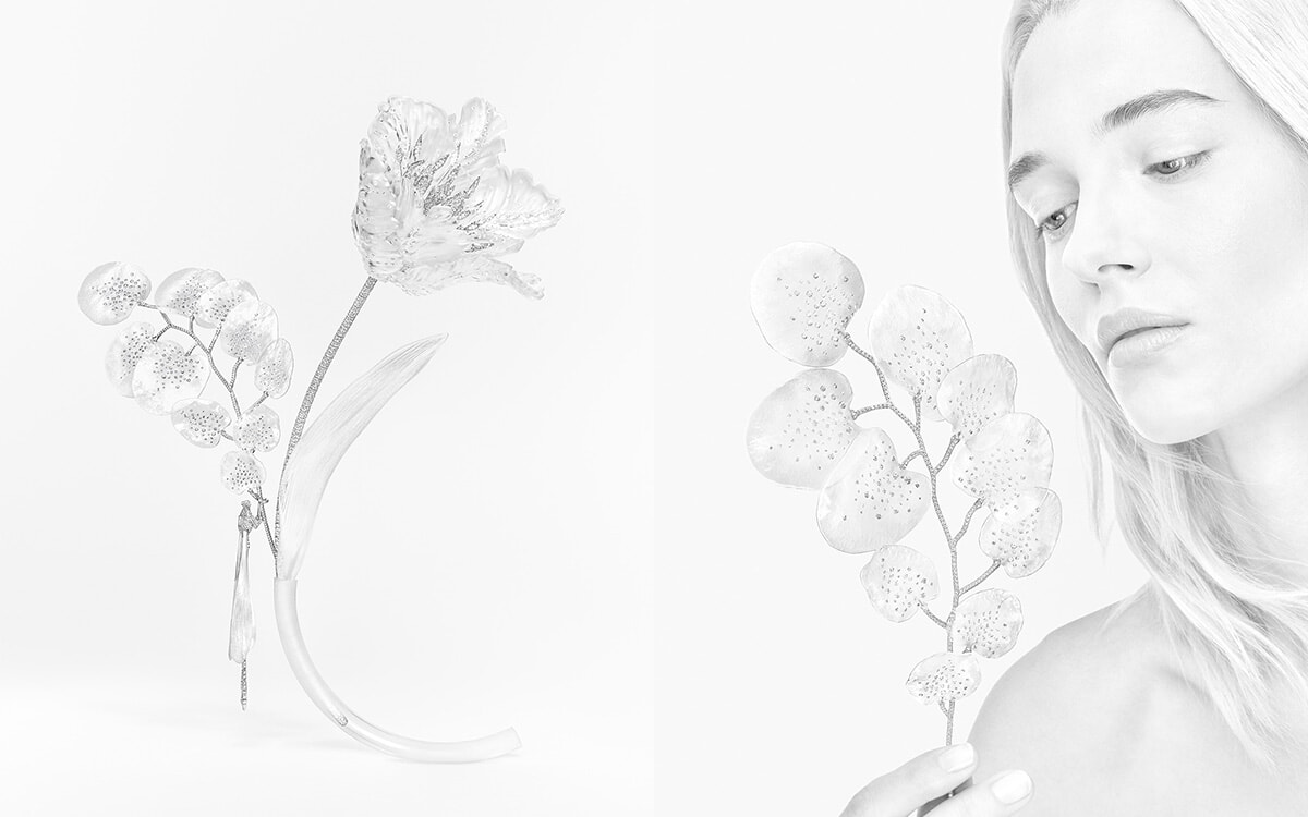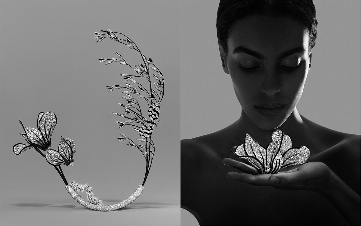 日本の生け花にインスパイアされたというアートピースのような6つのコンポジション。花、枝、葉、昆虫など22点のハイジュエリーピースで構成されている。花器から花や枝を外して、ブローチやネックレスとして身に着けることができ、アートピースのような存在感とさまざまな方法で身に纏うことができる、マルチウエアラブルなハイジュエリーだ。コンポジションの始まりであるNO.6は光を感じさせるみずみずしい透明感で、次いで白、そして少しずつ黒が翳りをもたらし、最後のコンポジションNO.1では完全に黒となる。「光」を軸として、自然界における植物などの誕生から終焉へという生命のサイクルを象徴し、永続しない(インパーマネント)という無常の観念を表現し、自然がいかに儚く、尊い存在であるかを伝えるのだ。