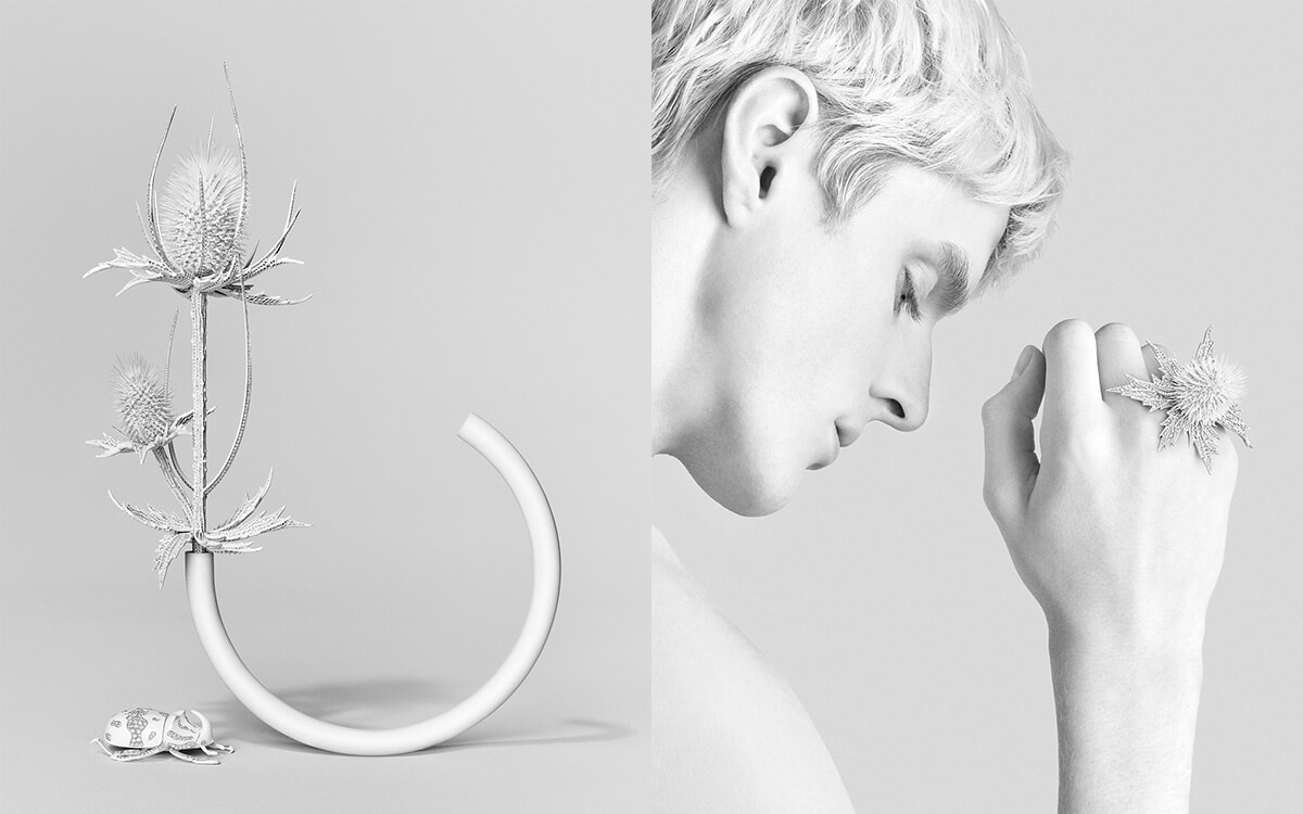 大きなアザミは取り外してブローチとして、あるいはバイオ由来素材で作られたコードを取り付けてクロスボディジュエリーとして着用可能。この素材もハイジュエリーとして初の試みだ。小さなアザミはダブルフィンガー リングとして、カブトムシはブローチとして着用できる。