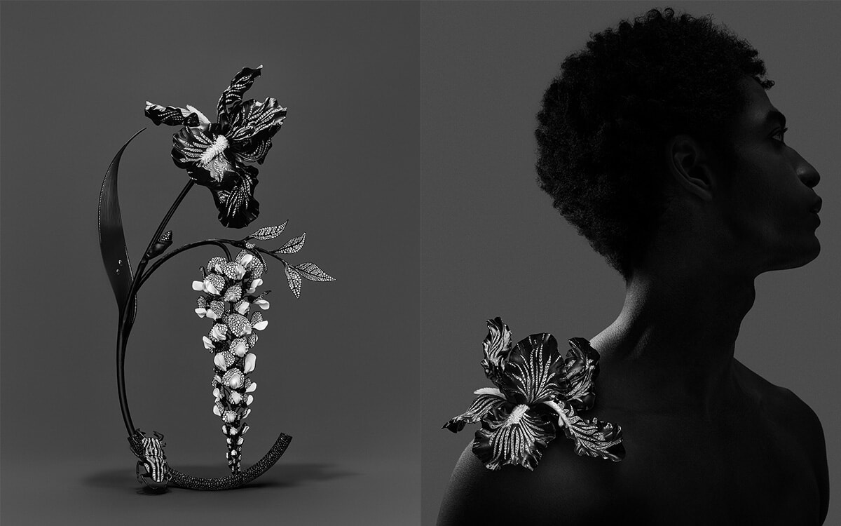 漆黒の世界に繊細なダイヤモンドの輝きのコントラストが映えるコンポジション。藤の花房が求める堅牢かつ軽量であるという相反する要素の両立もまた職人たちには難題だった。セラミック、チタン、アルミニウムといった軽量素材を巧みに組み合わせ、デザインのボリュームを損なうことなくわずか150gへの軽量化に成功。約100もの独立したパーツから構成される花房は、職人たちの手作業で丁寧に組み立てられ、自然に垂れ下がっている様は本物の藤のよう。葉や花びらにセッティングされたダイヤモンドが作品全体に光のニュアンスを添えている。小さな花びらや蕾にはホワイトセラミックが用いられ、質感の変化がより豊かな表情を引き出している。アイリスの花びらに黒いチタンとダイヤモンドが描くのは、黒と白のコントラスト。花芯はアザミと同じく3Dプリントして成形したバイオ由来樹脂によって構成されて、とてもリアルだ。蕾にはブラックスピネルがあしらわれ、アイリスの葉にはグレイン セッティングされた2列のダイヤモンドと、2粒のロッククリスタルによって朝露が滴るかのようなリアリズムが表現されている。ブラックスピネルをパヴェセッティングしたアルミニウム製の花器には、黒とダイヤモンドの縞模様が愛らしいスカラベ。