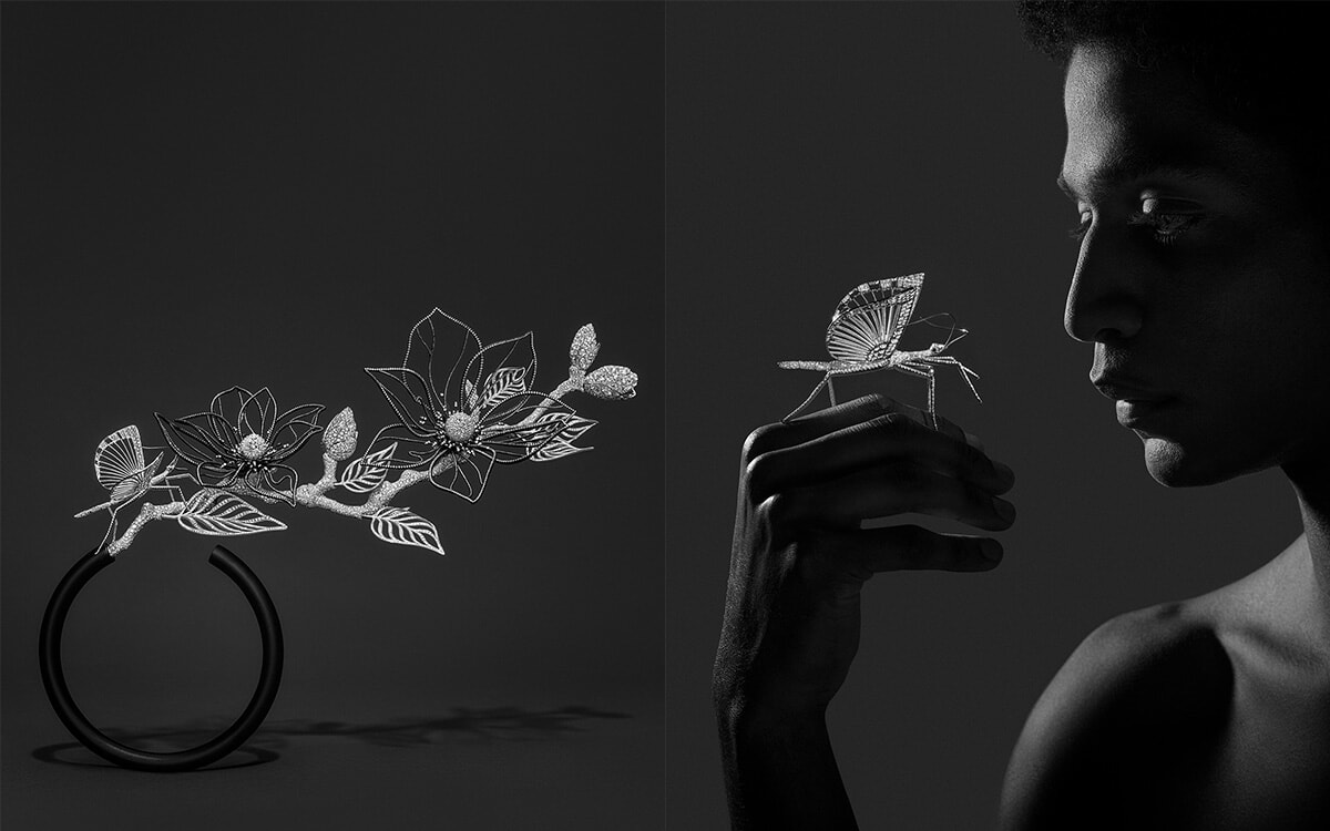 クレールが求めたのは植物本来の姿さながら自由に枝を伸ばすマグノリアのドラマティックな存在感。メゾンの職人たちがマグノリアをスキャンして、枝や花、蕾の細部まで正確に捉えたという。その水平に広がるシルエットのために軽量かつ光沢感のあるアルミニウムとシルバーを使用し、そこにダイヤモンドをスノーセッティングして有機的質感を生み出した。輪郭だけの花弁はブラックセラミックコーティングを施したアルミニウム製で、直線状に並られたダイヤモンドが繊細な輝きを放っている。ホワイトゴールドの花の中心部にはキューレット(ダイヤの尖端)が外向きになるよう上下逆にセッティングを施すという斬新な技術が用いられた。雄しべはブラックロジウム仕上げを施したホワイトゴールドで精緻に彫刻され、そこにダイヤモンドをセット。蕾はローズカットとラウンドブリリアントカットのダイヤモンドがあしらわれたロジウム仕上げのホワイトゴールドだ。マットな質感のブラックコンポジット素材の丸みを帯びた花器からマグノリアの枝に身を伸ばしているのはナナフシ! ロジウム仕上げのホワイトゴールドで造形され、ボディと翅にはグレインセッティングのダイヤモンドがあしらわれ、頭部にはペアシェイプダイヤモンドが輝いている。