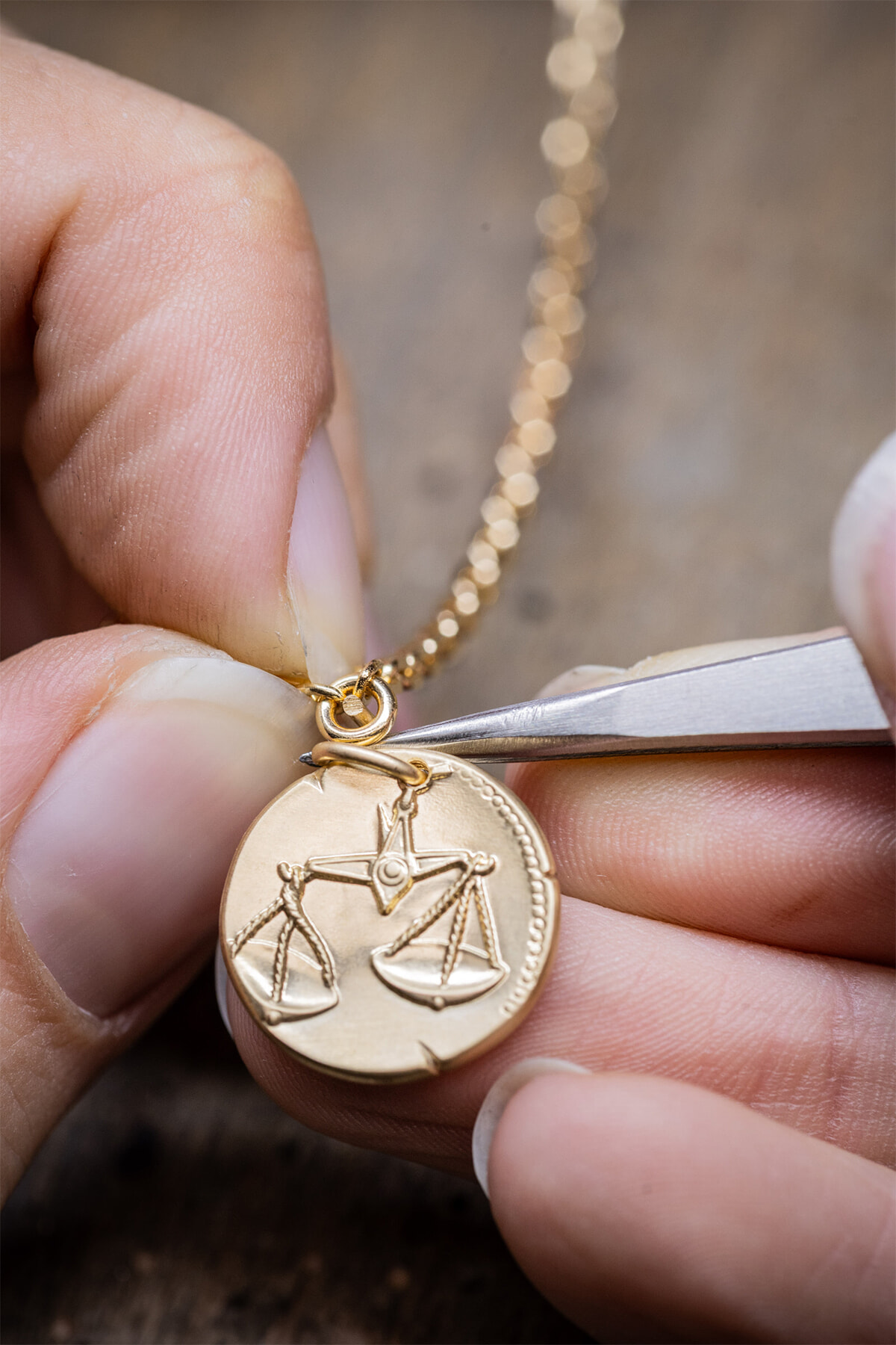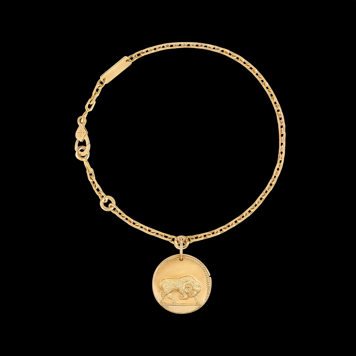 メゾンのヘリテージを再解釈し、今年発売されたのが、イエローゴールドのメダルを彷彿とさせる12点のブレスレットだ。直径16mmという手首に適したサイズのメダルが、ジャンプリングによってチェーンから吊り下げられたデザイン。クラスプが目立たないようにメダルが近くに配置されているため、動きに合わせて軽やかに揺れる。メダルの表面には西洋占星術の各星座を示す図像、裏面にはその記号とローマ数字で記された該当期間を刻印。たとえば、乙女座のメダルにはユニコーンを伴った優美な若い女性、牡羊座のメダルには躍動感あふれる牡羊が描き出されている。