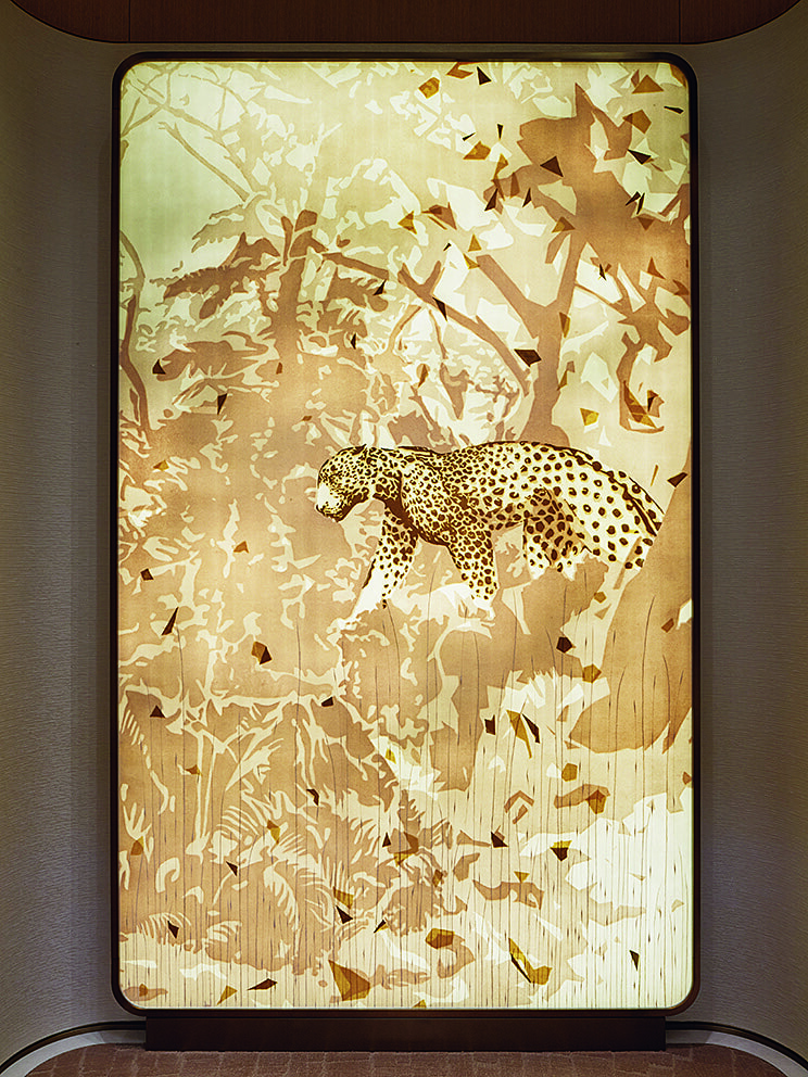 入口正面からまず目に飛び込んでくるのは、森の中を歩くパンテールのアートウォール。和紙作家の堀木エリ子によるもの。透明感と光を湛えた繊細な質感の本作は、4層漉きの和紙仕上げ。