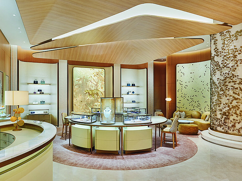 なめらかな曲線に縁取られた巨大なジュエリーボックスを思わせる外観。昨年の秋、銀座に誕生したカルティエ銀座4丁目ブティックだ。地上から4階から成る館内へと足を踏み入れると、ゆったりとした空間が広がる正面に「パンテール」のアートウォールが存在感を放つ。
