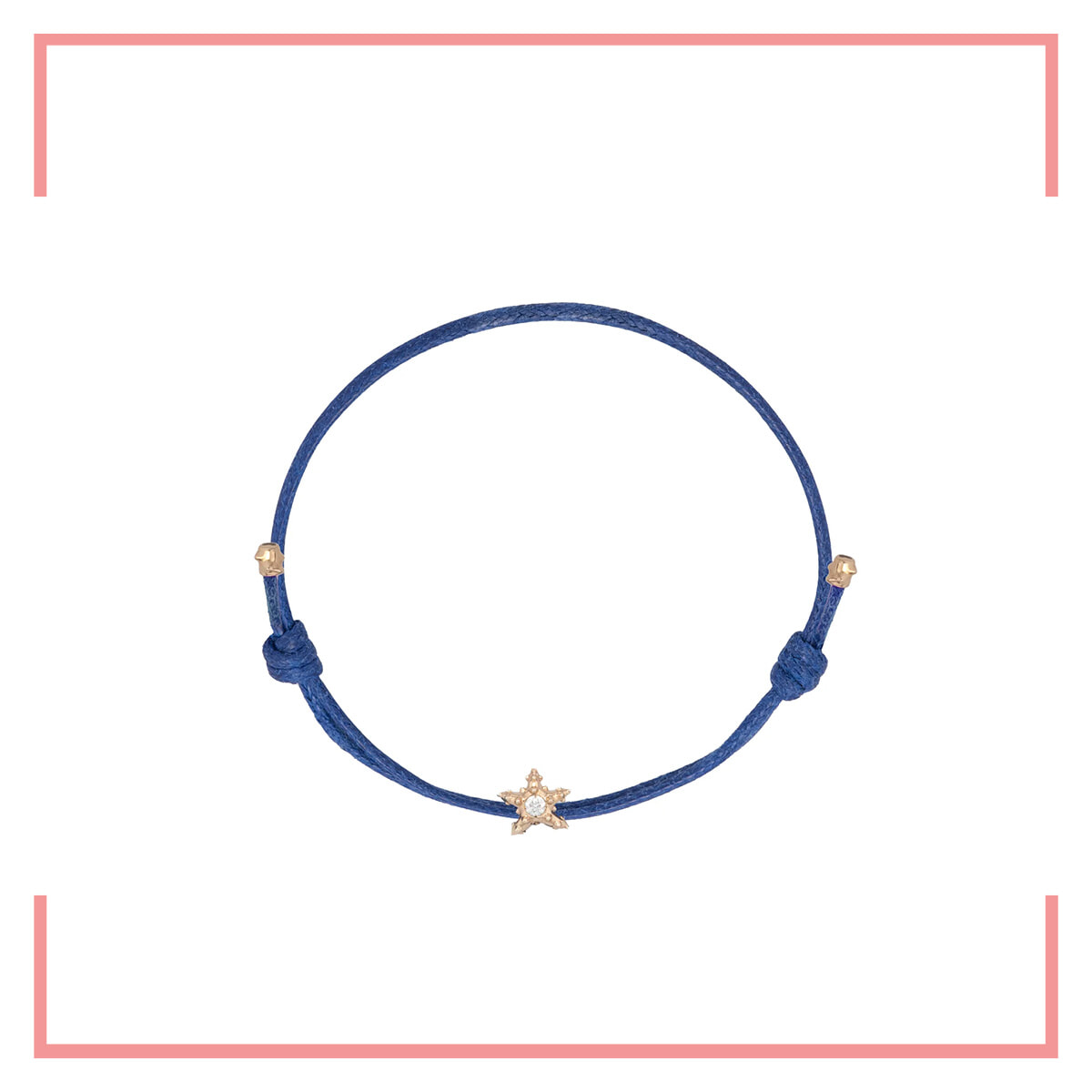 ホワイトブリリアントカットのダイヤモンドをセットしたモチーフが手元で控えめに主張する華奢なブレスレット。調節可能なロイヤルブルーのコードとのコントラストが効いたアイテムで装いにスパイスをひとさじ。