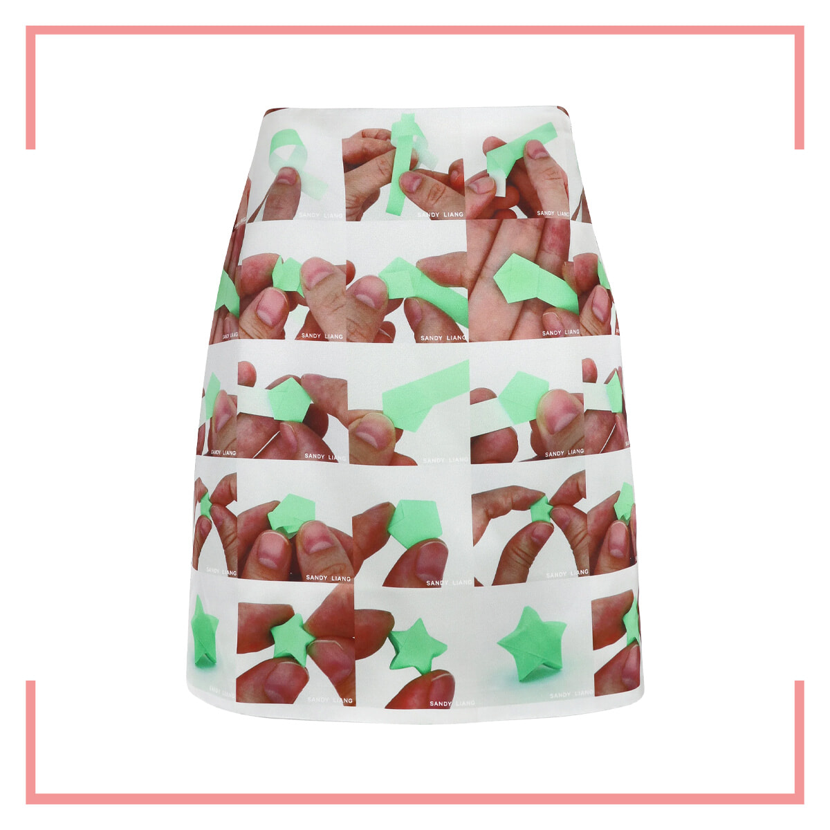 折り紙でスターモチーフが完成していく過程を、1コマづつプリントされたユニークなデザイン。1点投入でエッジの効いたスタイルが叶うスカートで、周囲の視線も幸運も惹きつけて。