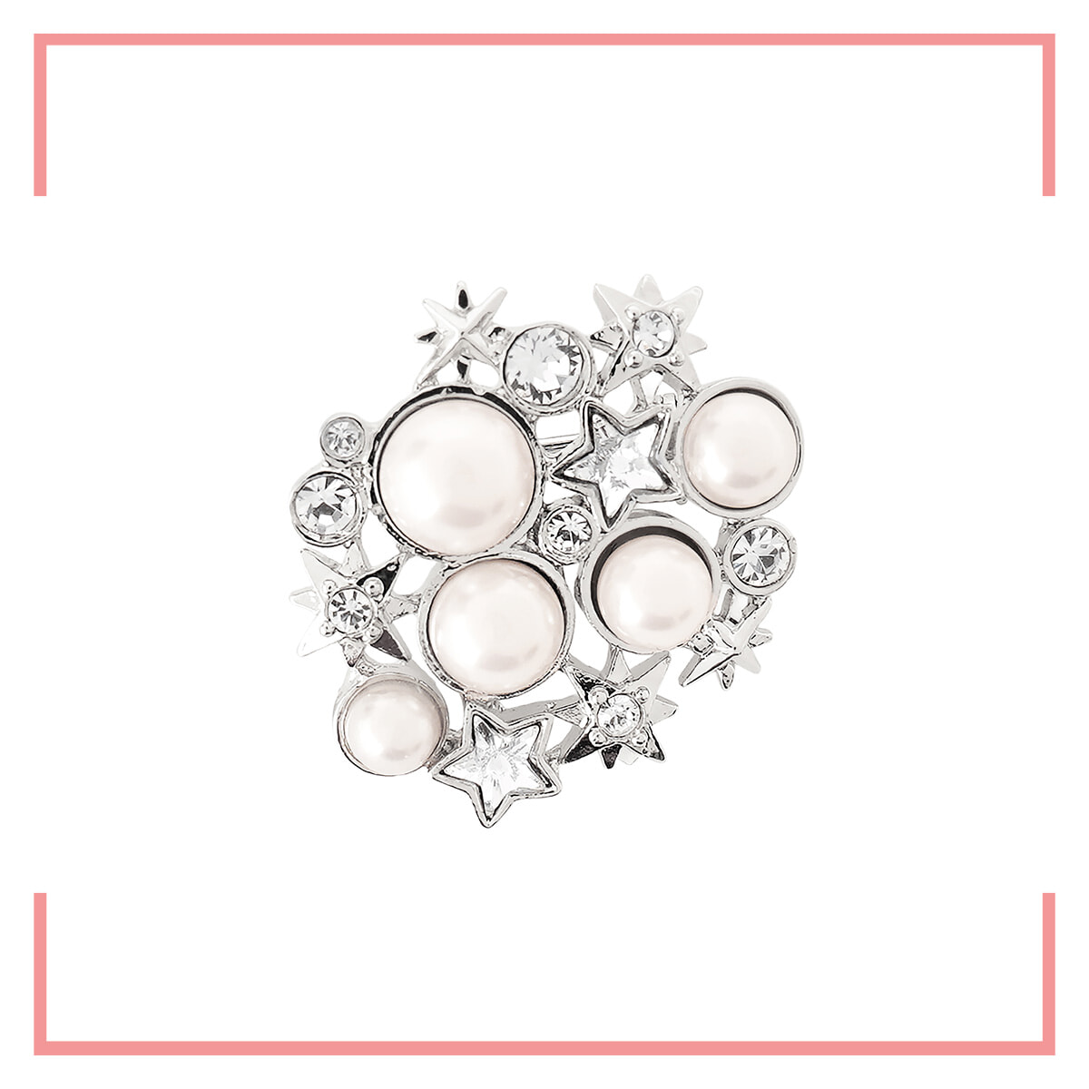 舞い散る雪やイルミネーションの煌めきを、カットガラスやパールで模ったロマンティックなデザイン。普段の装いのアクセントに、開運へ導く入り口を作って。
