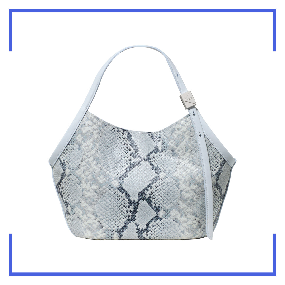 チューリップシェイプのバッグ「デコ コレクション」が、サファイアトーンのヘビ柄となった華やかな印象。デイリーからオケージョンまで、さまざまなシーンのフィットする相棒に。