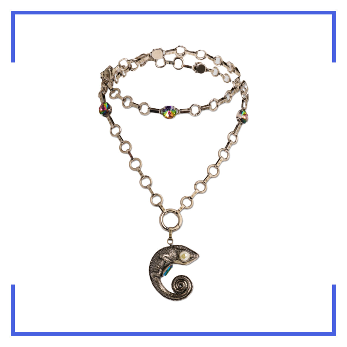 つぶらな瞳や、くるんと巻いた尻尾がペイズリーを想わせる愛くるしい佇まいに思わず惹き込まれるネックレス。繊細な加工により、ジャカードで織られたブランドのアイコニックなペイズリー柄の質感を表現。ヨーロッパでは”賢者のシンボル”と親しまれるカメレオンを味方につければ、困難もなんなくやり過ごせそう。