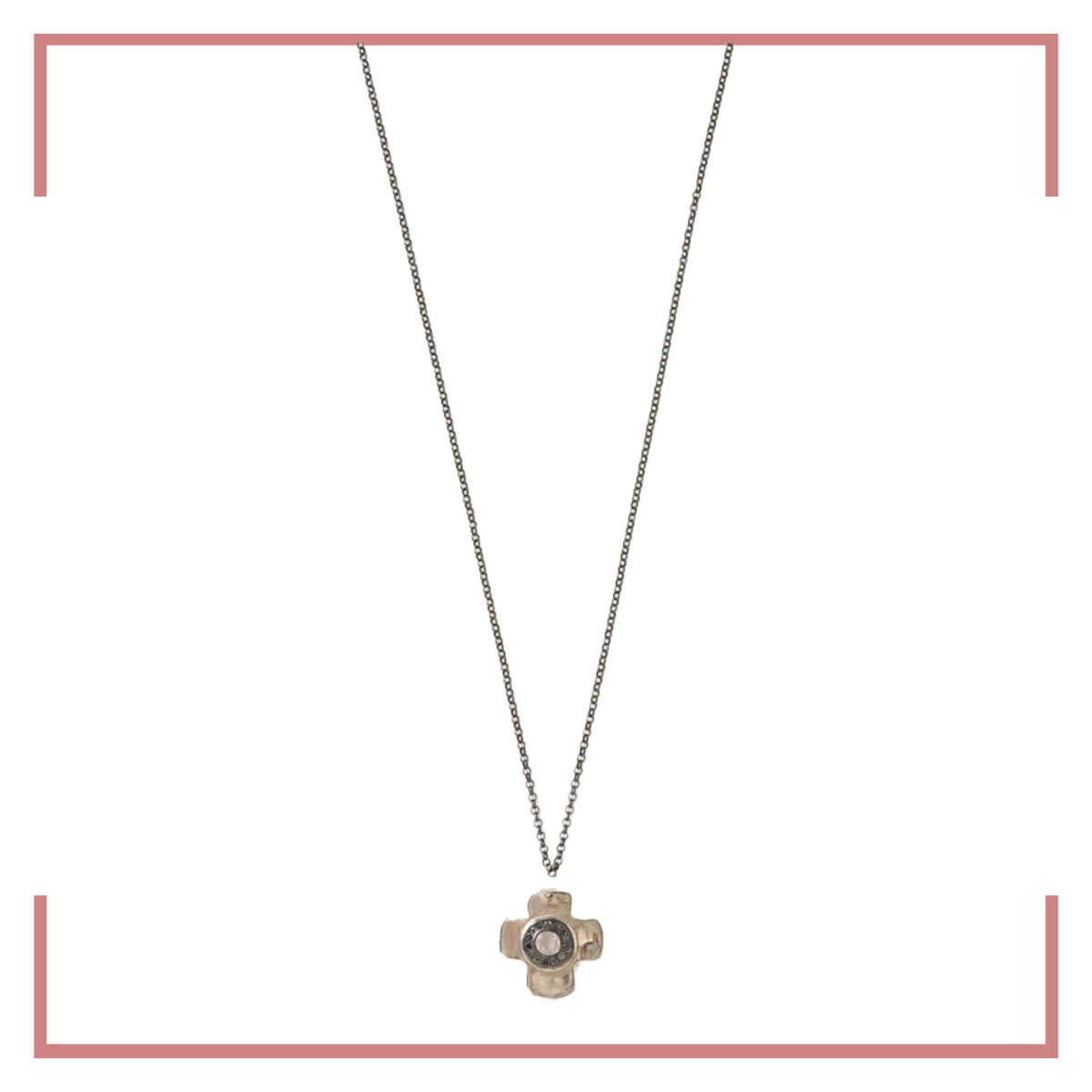 やわらかなピンクの光を宿すクロスに、霜のような輝きを纏うアイシーグレーのダイヤモンドをセッティング。静けさと優しさが重なり合い、日常にそっと寄り添うネックレスはお守りのように身に付けたい。