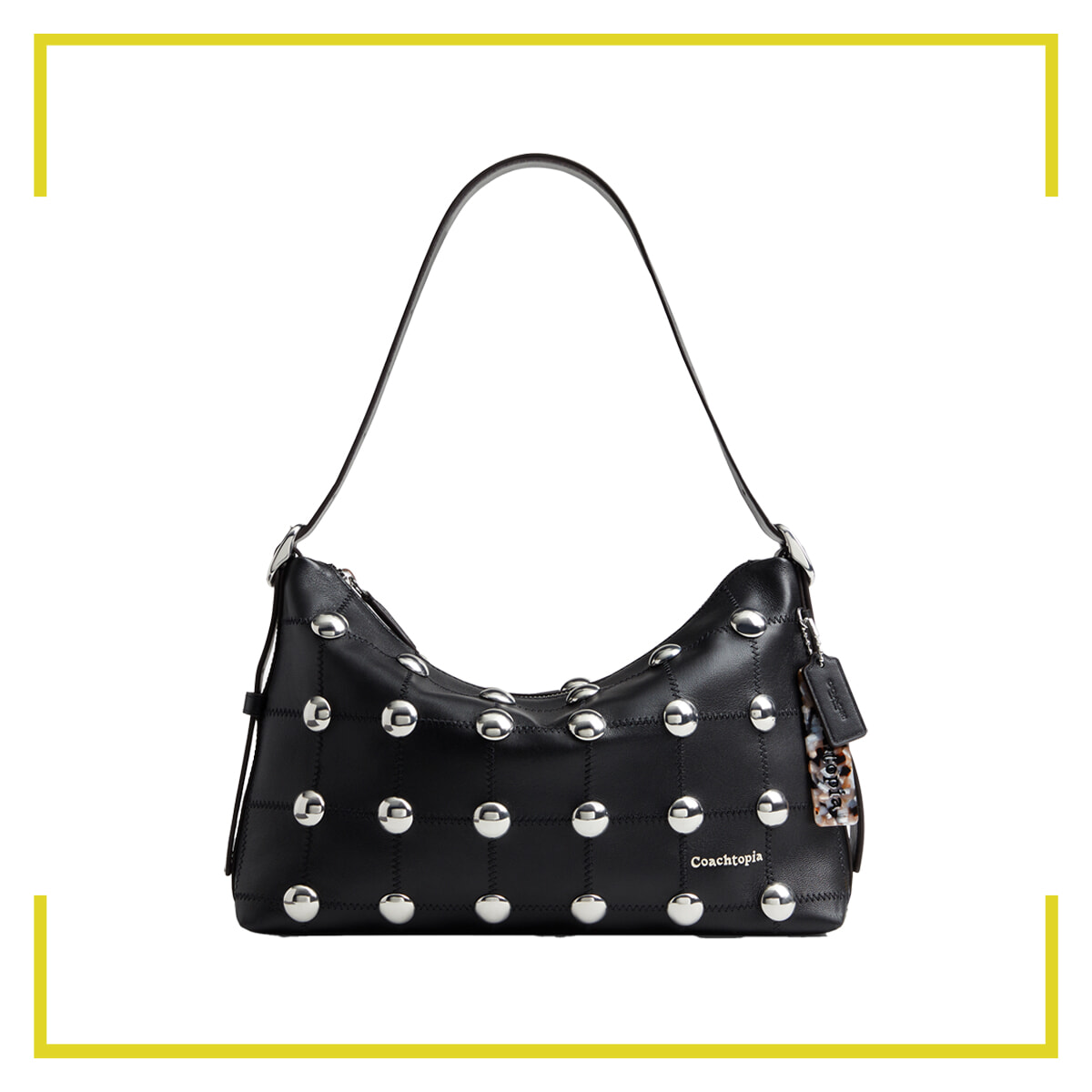 端切れを繋ぎ合わせたパネル仕立てのボディにメタルスタッズを施し、甘くなりがちなドット柄もパンキッシュなムードに昇華。デイリーに十分な収納力を備えるバッグは、外出時の良き相棒に。
