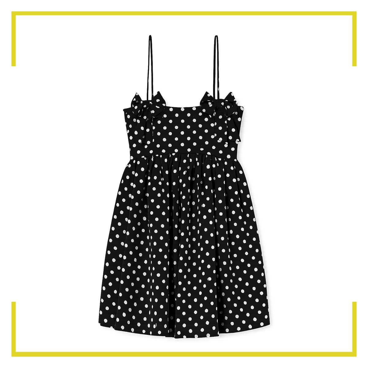 ポルカドット柄にリボンディテールを組み合わせた、可憐な印象のブラックミニドレス。ロマンティックなフレンチスタイルが叶う、上品な光沢感で幸運を包みこんで。