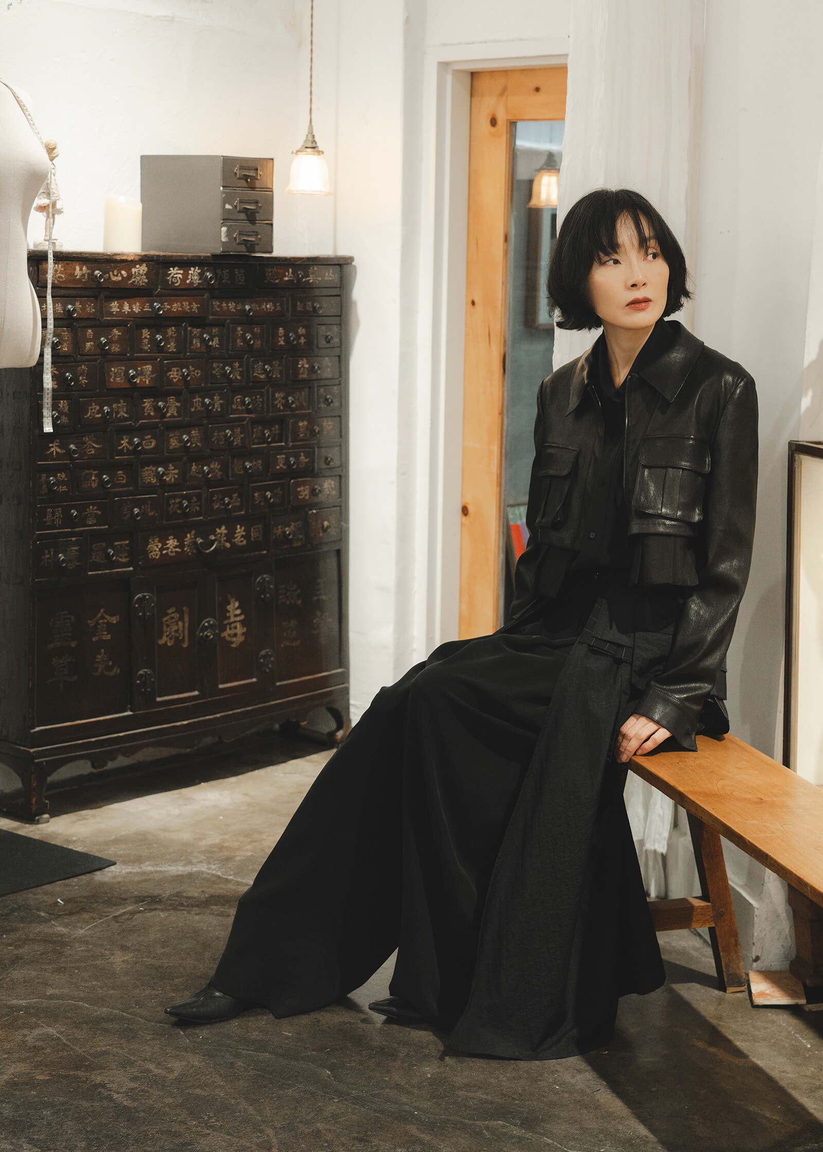 「自信に満ちた優雅な女性のための服を作ろう」との思いから姉妹で立ち上げたブランド。ミニマルかつクラシックなムードをベースに、女性の内面に宿る本質的な強さを引き出すデザインが魅力。デザイナーのユ・イナ(妹・写真)は、ロングプリーツスカートのようなドレッシーなワイドパンツを主役に、端正なテーラードコートを合わせてスタイリッシュにコーディネート。柔らかくて着心地のいいスーパーファインメリノウールの半袖ニットをインナーに忍ばせ、ベルトマークでメリハリを。