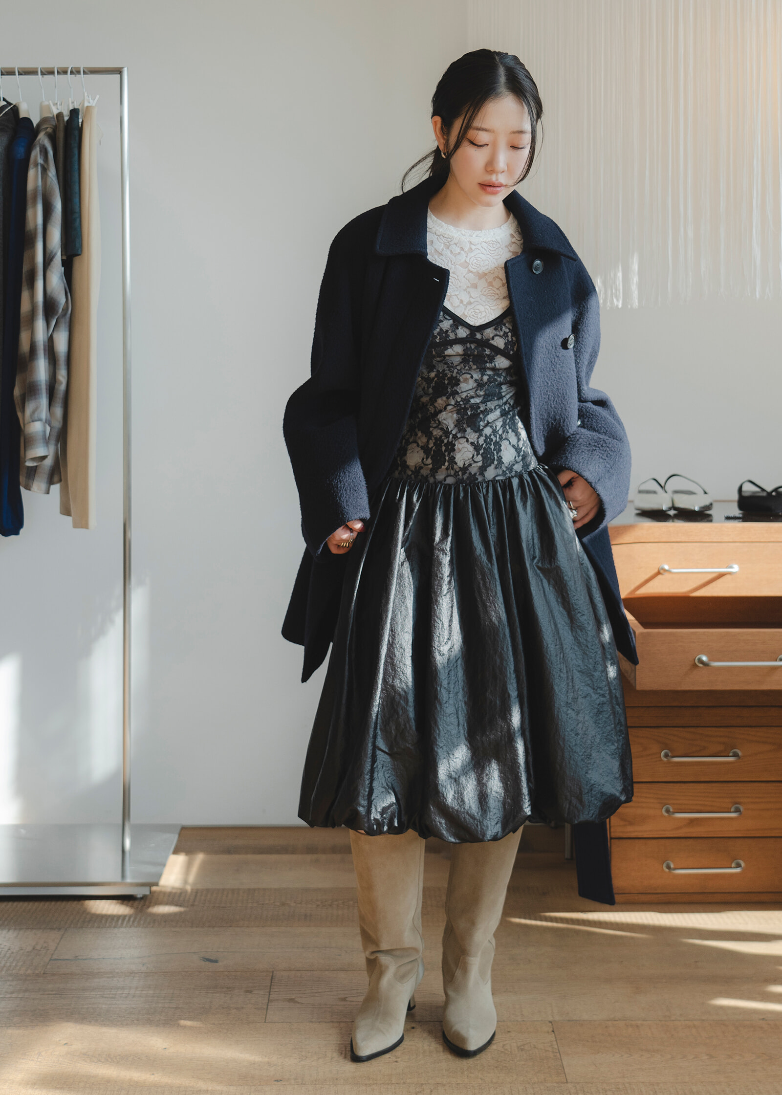“ヴィンテージクラシック””過去から現在”をテーマに、ヴィンテージアイテムをモダンに再解釈させたようなロマンティックなデザインが魅力。ブランドマネージャーのパク・スヨン(写真)は立体感のある起毛レースのTシャツにブラックレースのワンピースを重ね、ほどよい肌見せスタイルに。ほのかな光沢を帯びたバルーンスカート、ショルダーが構築的に膨らむウールコート、スエードブーツを合わせ、異素材のミックスマッチを楽しむ。スカートとブーツの丈を揃えることで、大人のバランスに仕上げて。