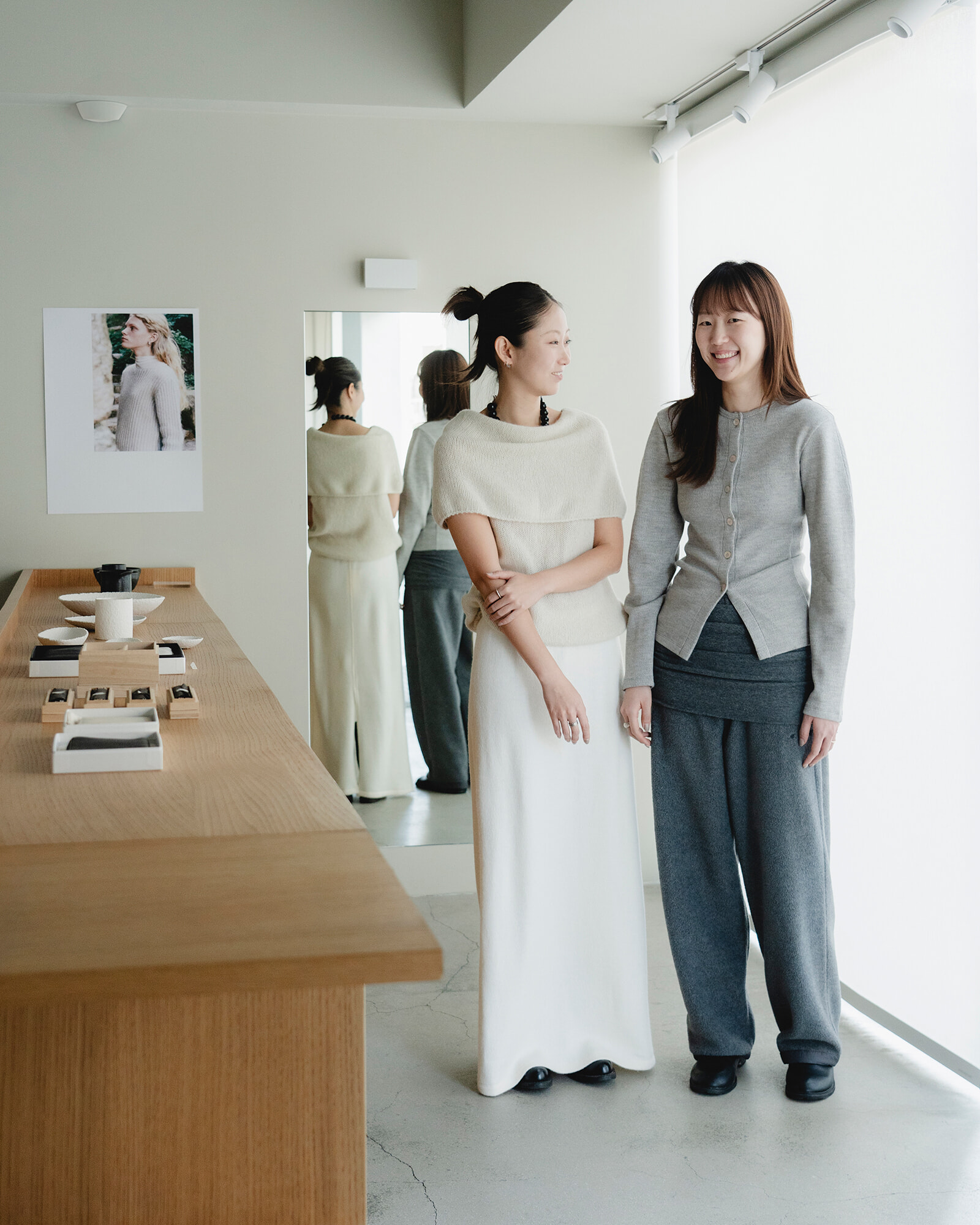 “余白の美しさ”をコンセプトに、伝統とモダニズムがミックスされた上質な洋服と工芸品を扱うモノハ。無駄な装飾を削ぎ落とした、シンプルでナチュラルなデザインはソウルのファッションラバーからも好評。ショップスタッフのキム・ウンギョ(写真左)が着るのはケープのようなディテールがユニークなトップと厚手のリブジャージーニットのラウンジスカート。エレガントなスタイリングながら着心地も忘れない。グレーのレイヤードスタイルがモダンなイ・シハ(写真右)のスタイリングは、コンパクトなボディと袖のボリュームが好バランスなカーディガンに、ラフなフリースパンツを合わせてカジュアルに。