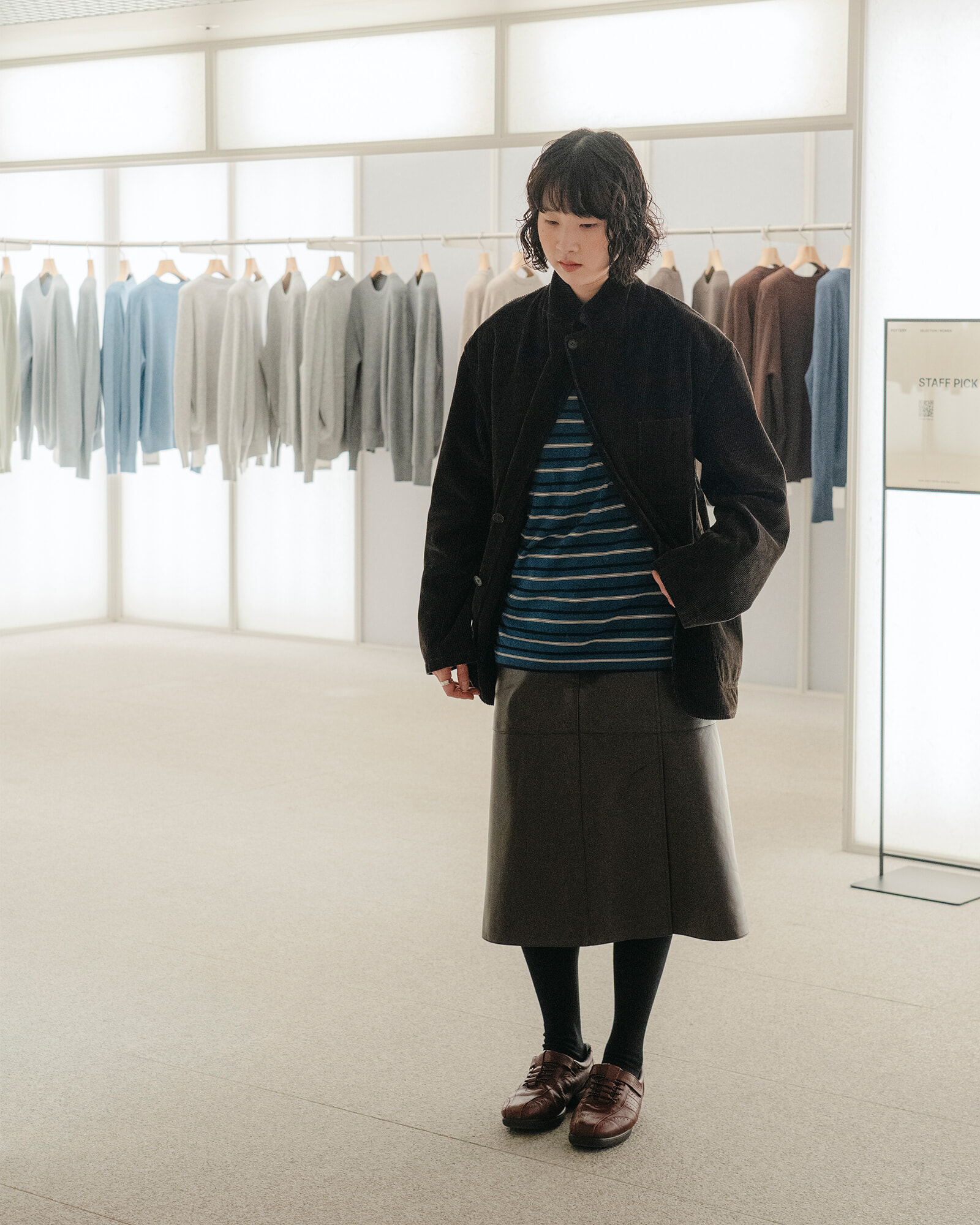 “現代のユニフォーム”がコンセプトのポトリ。派手なデザインディテールやロゴは削ぎ落とし、メンズウエアのテーラリングの構造を軸に、生地とパターン、製法にこだわったミニマルな服を作っている。ブランドコミュニケーターのパク・ガウン(写真)が着るのは、控えめな光沢感が上品なラムスキンレザーのミディスカートにクレープコットンのラグビーポロニット、英国ブリスベン・モス社のコーデュロイ生地を使用したブレザー。異なる質感とトーンをミックスさせたマニッシュなコーディネート。