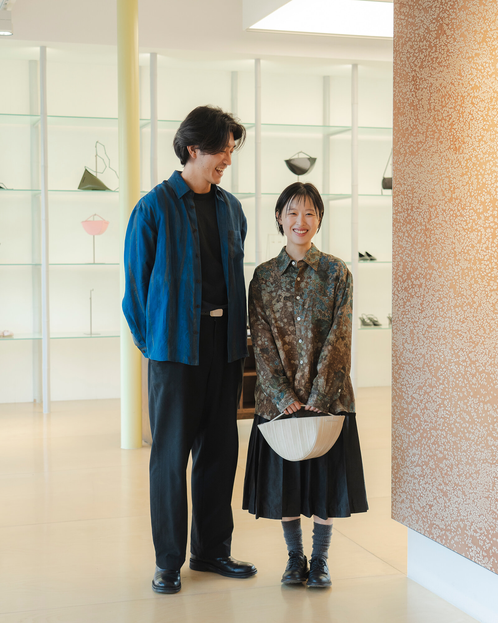 韓国生まれの素材と伝統的な天然染色技法を駆使したファッションライフスタイルブランド。韓国各地の工芸職人からデザインのインスピレーションを得て、有機的な模様や自然から抽出される色をデイリーウエアに投影させる。鮮やかな藍と柿の葉で染めたストライプ模様のブルーシャツを自前のコットンパンツと組み合わせたショップマネージャーのクォン・スンジェ(写真左)。隣のクォン・ユミ(写真右)は、塩染めによって浮かび上がる不規則な色柄がユニークなシャツをメインに、泥染めシルクのスカートやイール革のシグネチャーバッグなど、モノトーンアイテムで統一。
