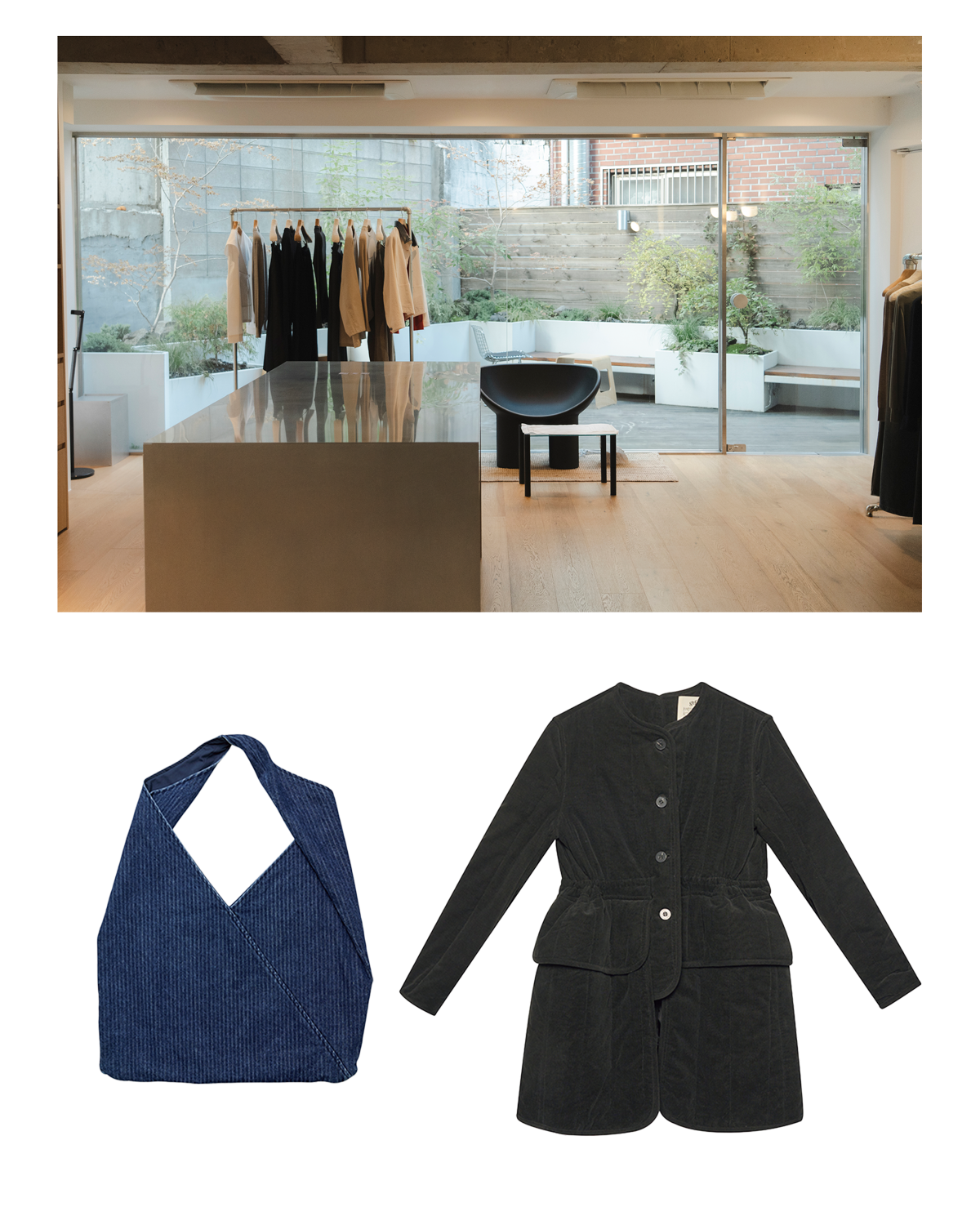 上:全面ガラス張りのバルコニーを備えた風通しのいい店内。 下左:エコバッグとしても活躍しそうな大判のデニムバッグ 78,000ウォン 下右:ウエストシェイプされた構築的なジャケット 408,000ウォン