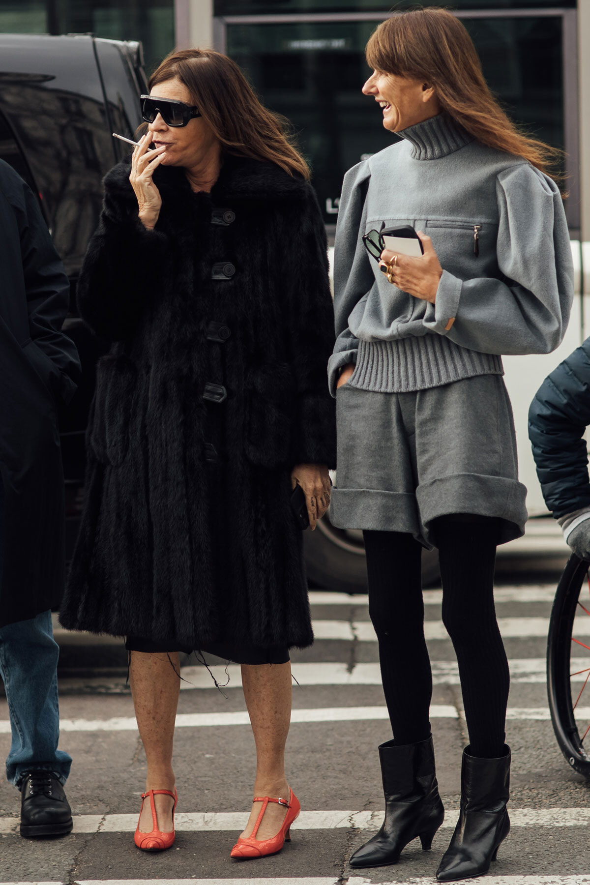 次はパリのストリートで一服中のカリーヌ・ロワトフェルド。ヴィンテージなのか?リアルっぽい質感のファーコートをお召しであったかそうだが、足元は素足にパンプス。ランウェイやファッション撮影でありそうなスタイリングを実演していて強い。