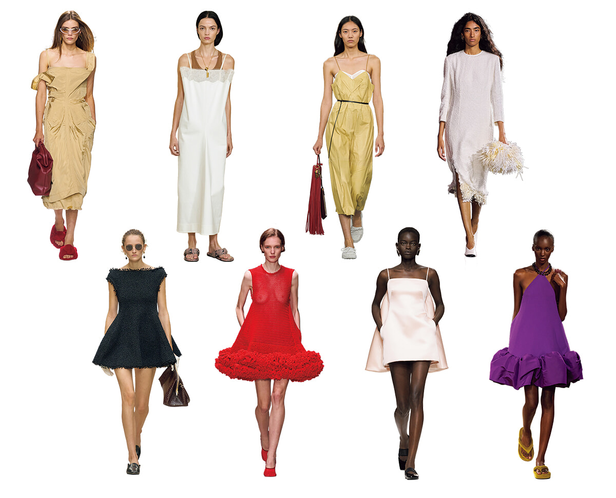 軽やかなエレガンスの風を受けて、春夏の定番、ドレスが美しくアップデートされて登場。着丈もデザインもさまざまに展開されたが、注目はセリーヌやジバンシィが代表のシルエットコンシャスなベビードール風と、ボッテガ・ヴェネタやカルバン・クラインの提案するミモレ丈でニュートラルカラーのクワイエットドレス。どちらも一枚で季節のときめきを届けてくれる。