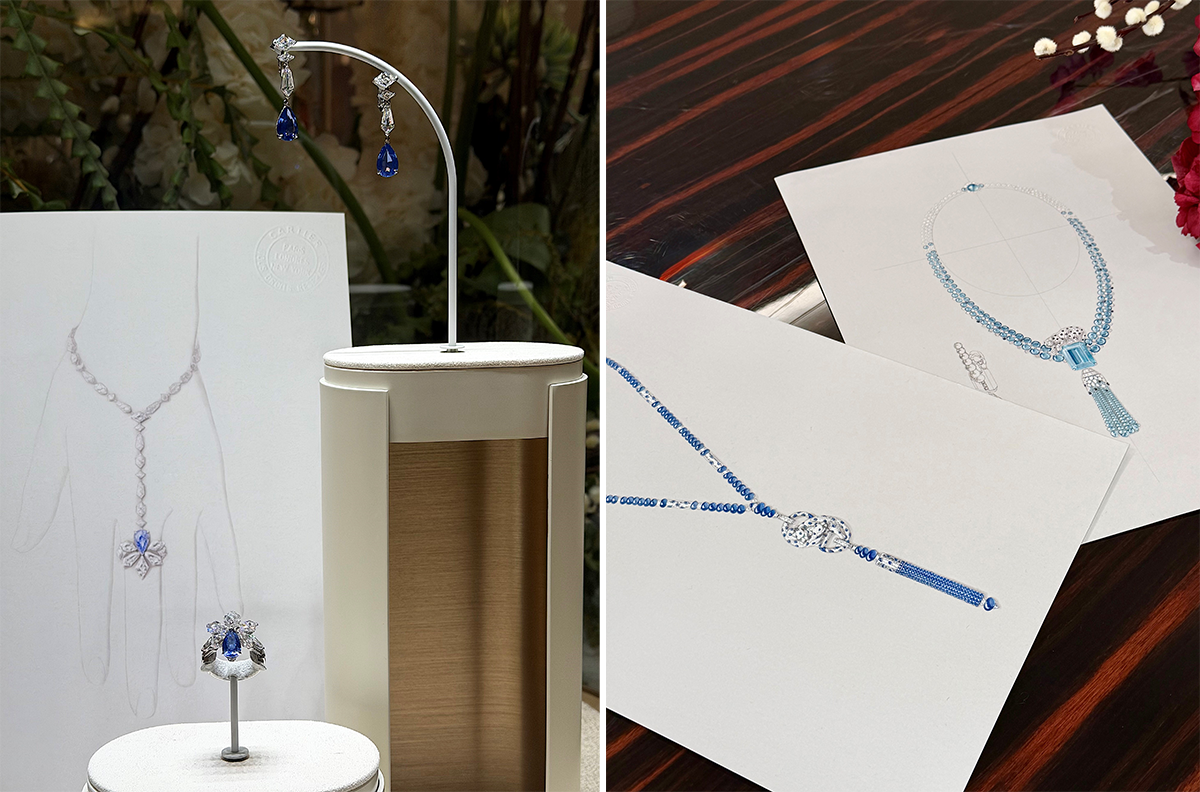 会場より。(左)「パルセ」のサファイアを中央に据えたリングは、後方のデッサンのようにダイヤモンドが連なるチェーンブレスレットに組み合わせてハンドジュエリーとして使える。(右)会場では過去の関連ジュエリー、新しいコレクションのデッサンも展示された。メゾンのアイコンであるパンサーをあしらったジュエリーは2点。「Panthère Algarrobo」ネックレスでは巨大なアクアマリンの上に君臨し、「Blue panthère embrassée」ネックレスではしなやかに2匹が絡み合っている。© Cartier photography: Mariko Omura