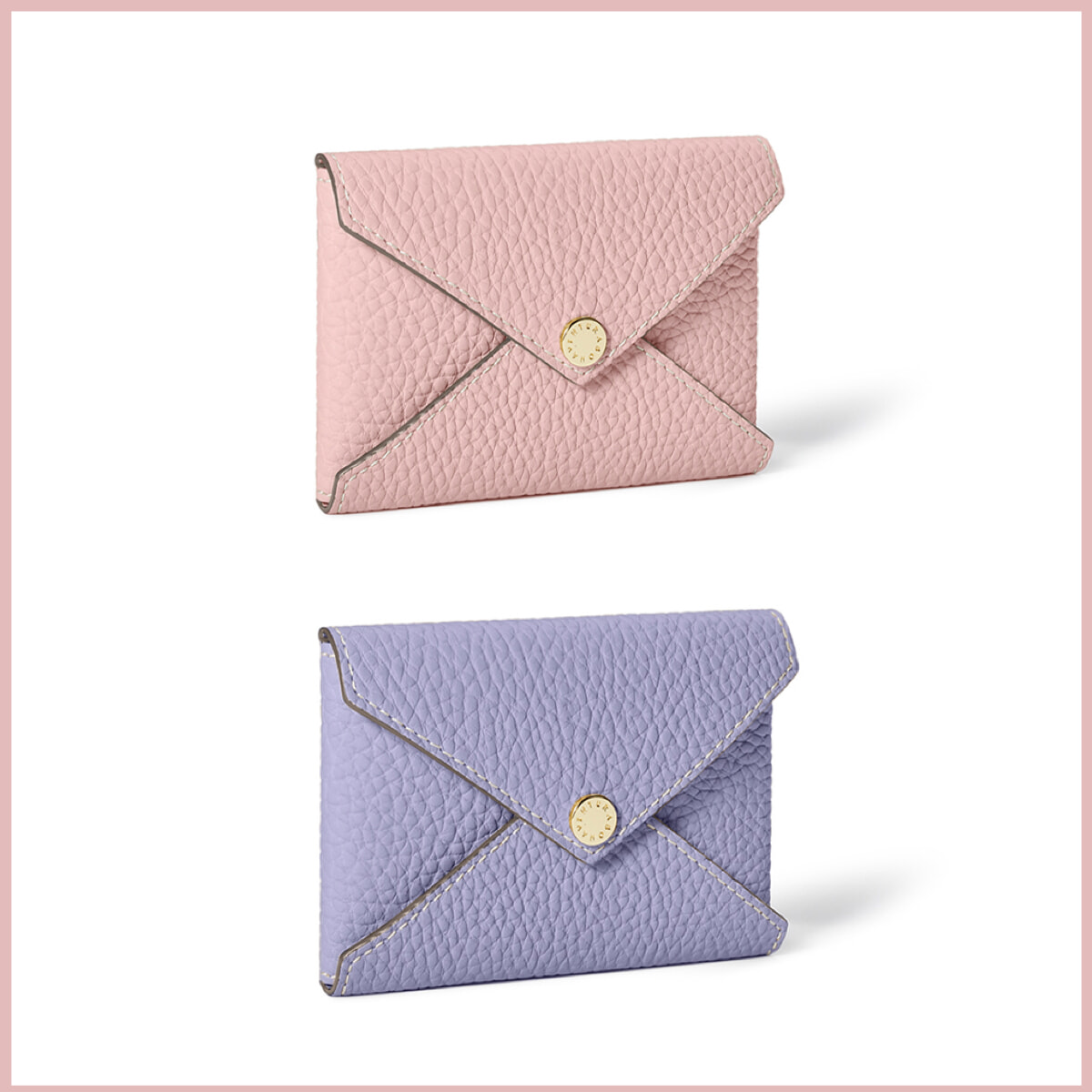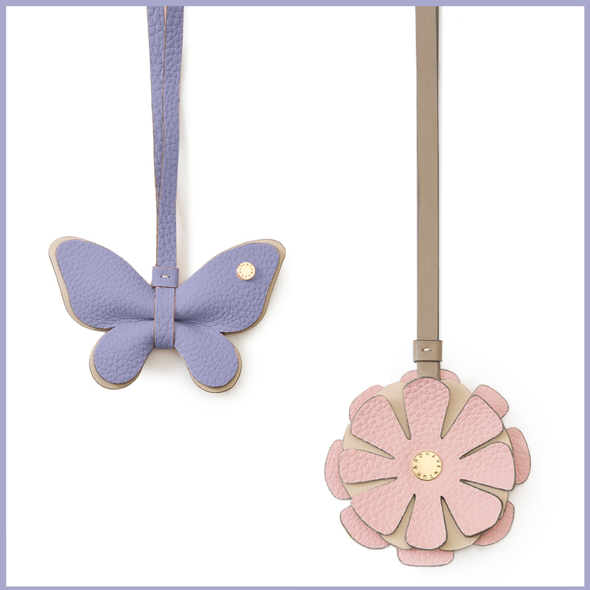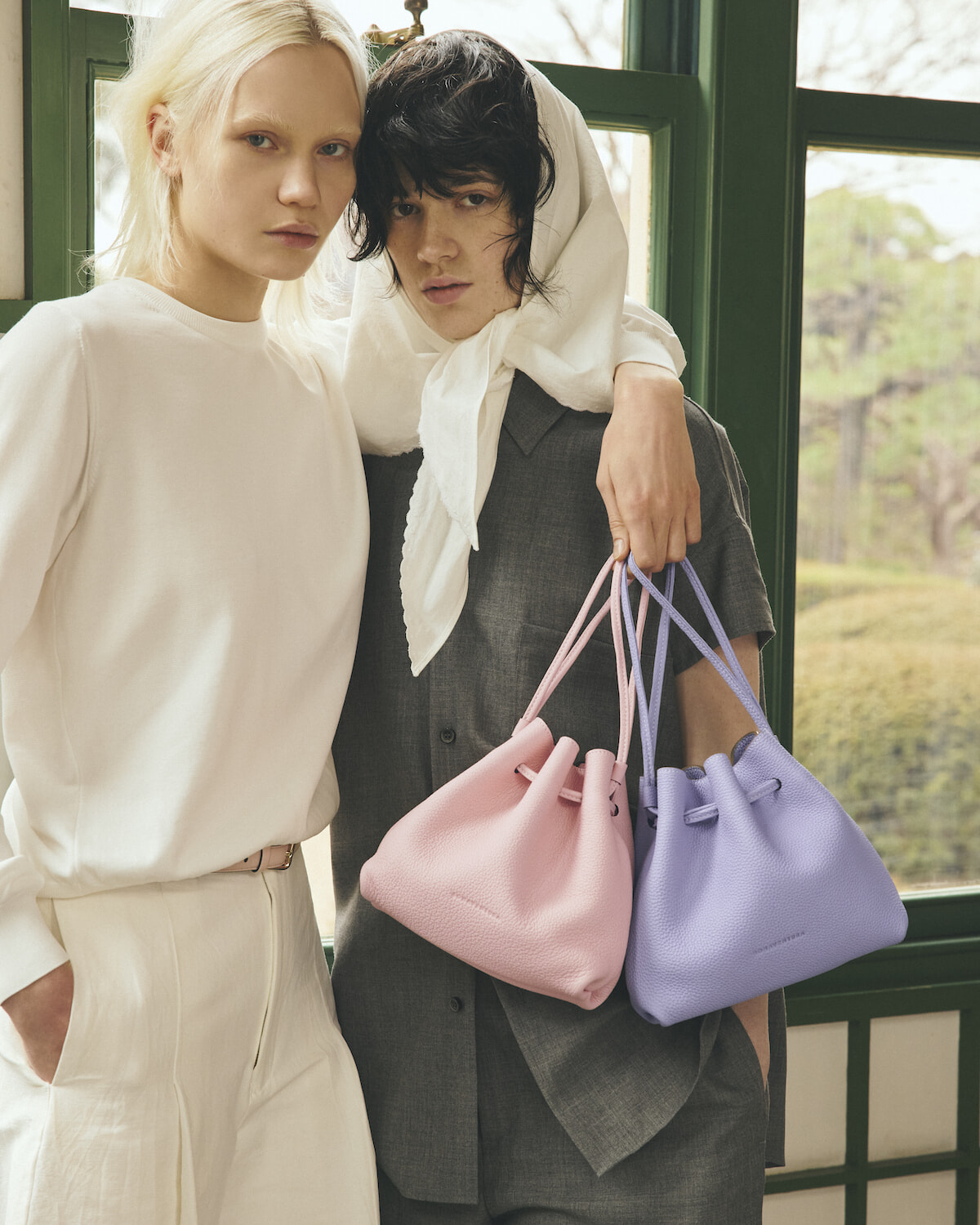 モデル左:バッグ「ノア バッグ シュリンクレザー」サクラピンク、ウィステリアパープル(H18×W20×D7.5cm)各¥88,000、、ベルト¥33,000/以上ボナベンチュラ(ボナベンチュラ カスタマーサポート) ニット¥29,700/スローン(ザ ショップ スローン 自由が丘) ショートパンツ¥45,100/エムティーモデリスト ピアス¥78,100/ヒロタカ(ヒロタカ 表参道ヒルズ) モデル右:シャツ¥66,000、ショートパンツ¥102,300、スカーフ¥50,600/以上マディソンブルー