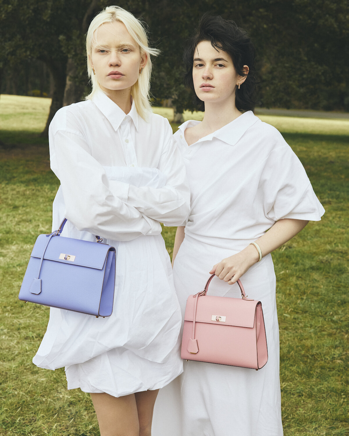 モデル左:バッグ「ヴィットーリア トップハンドルバッグ シュリンクレザー(スモール)」 ウィステリアパープル(H19×W25×D9cm) ¥253,000、ピアス¥24,200/ともにボナベンチュラ(ボナベンチュラ カスタマーサポート) ドレス¥60,500/リヴィアナ コンティ(イザ) シャツ/スタイリスト私物 右:バッグ「ヴィットーリア トップハンドルバッグ シュリンクレザー(スモール)」 サクラピンク(H19×W25×D9cm)¥253,000、ピアス¥24,200、バングル¥33,000/以上ボナベンチュラ ドレス¥73,700/アキコアオキ