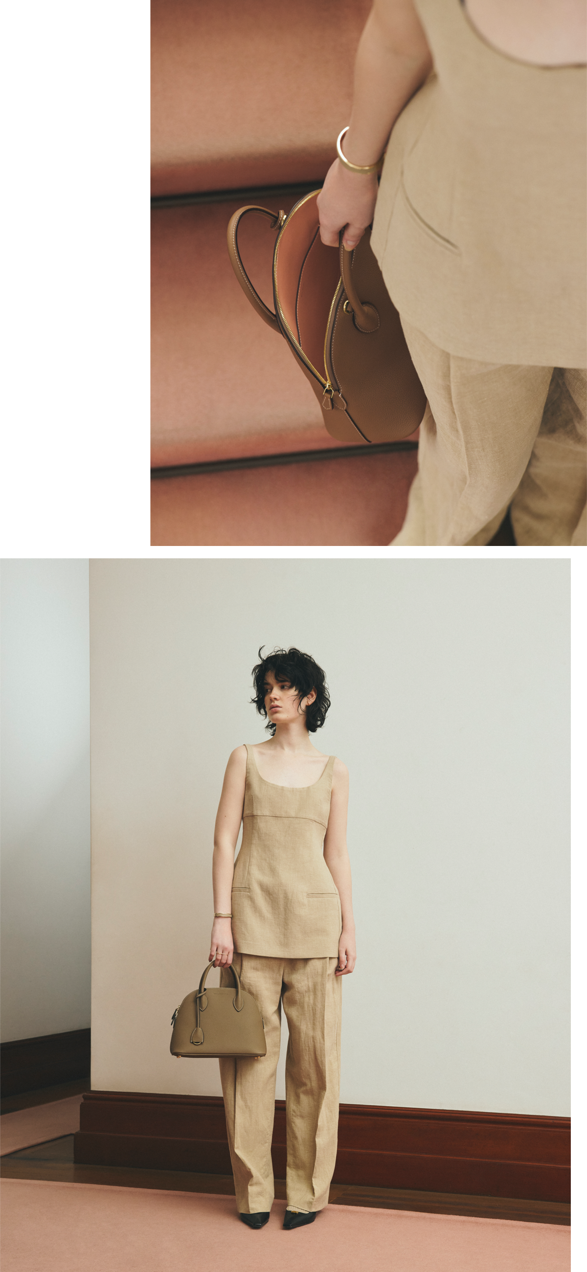 バッグ「エマ バッグ シュリンクレザー(28サイズ)」エトープ × ベイビーピンク(H22×W28×D12cm)¥198,000、バングル¥33,000/ともにボナベンチュラ(ボナベンチュラ カスタマーサポート) ドレス¥39,820、パンツ¥44,660/ともにテラ(ティースクエア プレスルーム) リング¥201,300、ピアス¥85,700/ともにヒロタカ(ヒロタカ 表参道ヒルズ) シューズ¥126,500/セルジオ ロッシ(セルジオ ロッシ ジャパン カスタマーサービス)