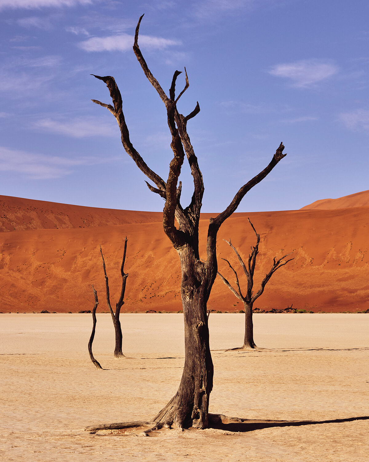 ナミブ砂漠のデッドフレイ。青い空、赤い砂丘、白い塩湖に、化石となってなお立ち尽くす黒い木々が、ナミビアを代表する光景だ。