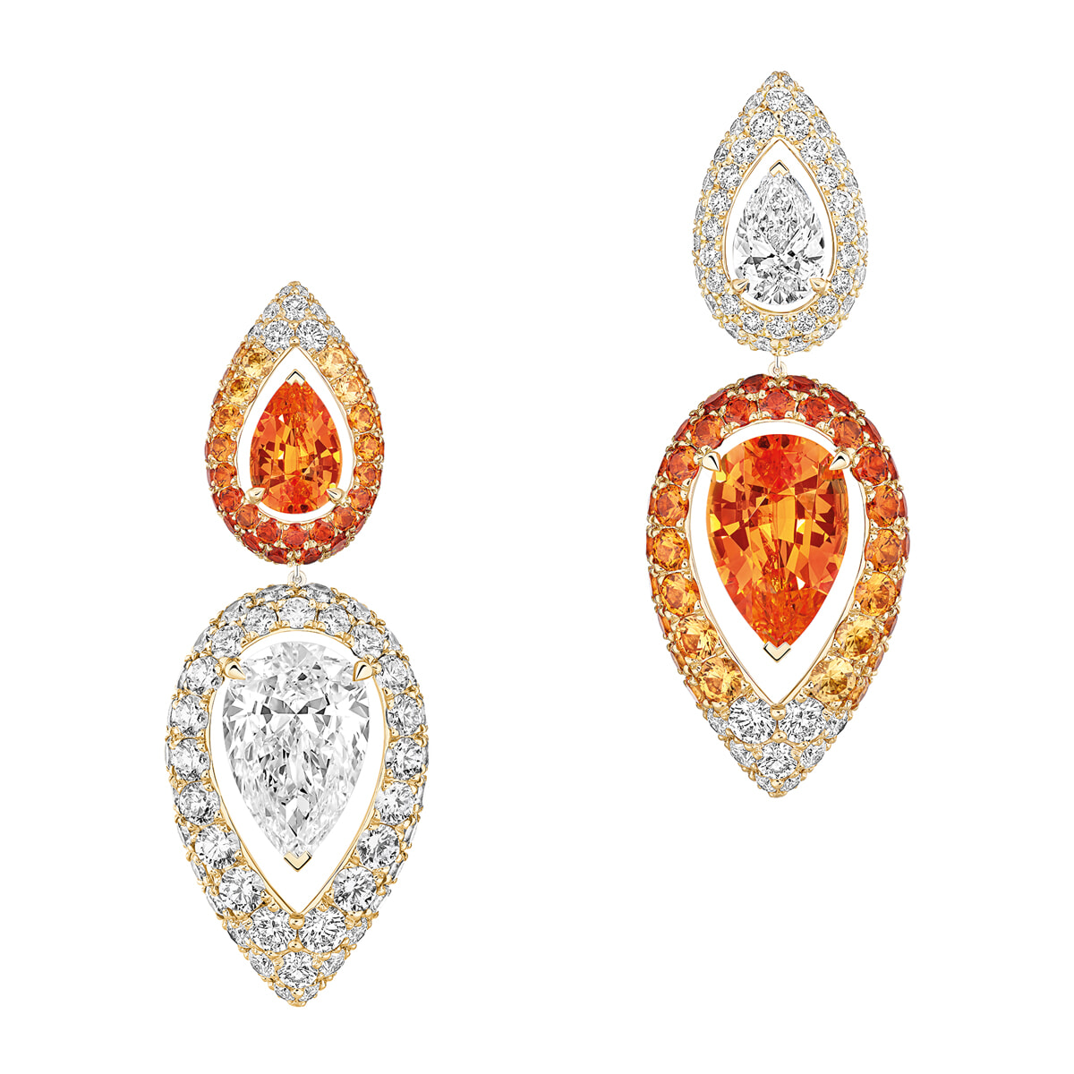 カラハリ砂漠の燃えさかる夕焼けを表現したヒプノティックシリーズから、メシカ初のカラーストーンを用いた新しい境地の作品のひとつ「ヒプノティック イヤリング」(YG×ダイヤモンド×ガーネット)¥13,310,000/メシカ(メシカ ジャパン)
