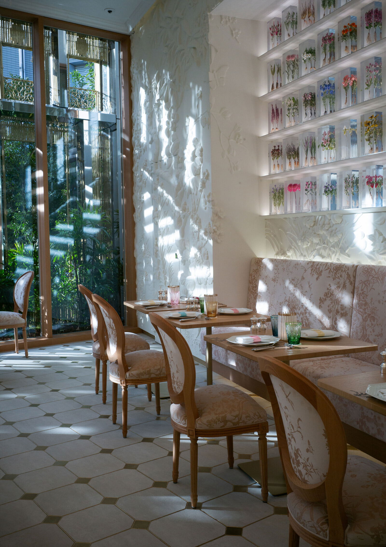 カフェ ディオールでは、東信による植物を温室へ閉じ込め展示した「パラダリウム」や「ブロックフラワー」が空間に瑞々しい生命力を添える。さらに、切り絵作家の柴田あゆみの作品が天井をエレガントかつドラマチックに彩る。そんなディオールが考える”アール ドゥ ヴィーヴル”(暮らしの美学)が満喫できる贅沢な空間では、フランスでミシュラン三つ星を獲得した唯一の女性シェフ、アンヌ=ソフィー・ピックが監修したメニューを提供。さらに光があふれる開放的なテラス席も用意されている。