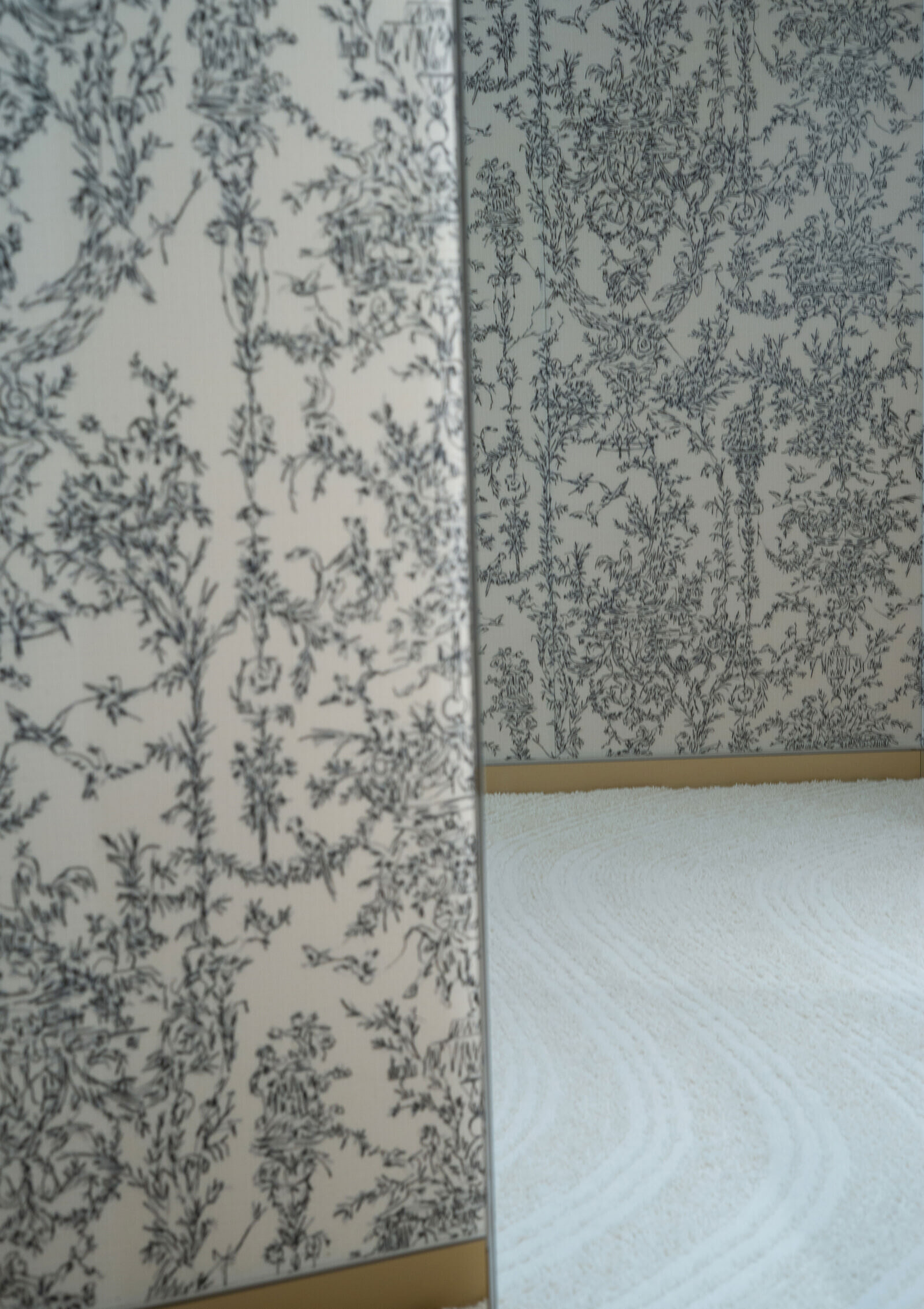 タイムレス ルーム内のフィッティングルームでは、テキスタイルデザイナー、光井花による刺繍壁が出迎える。ディオールらしいトワル ドゥ ジュイを着想源に手刺繍で仕上げた壁に、枯山水を想起させるフロアカーペットのパターンが静謐な世界観を生み出す。視覚的な美しさに加え、精神性を感じさせるインテリアデザインで、日本の美意識とディオールのクチュール精神を静かに重ね合わせている。