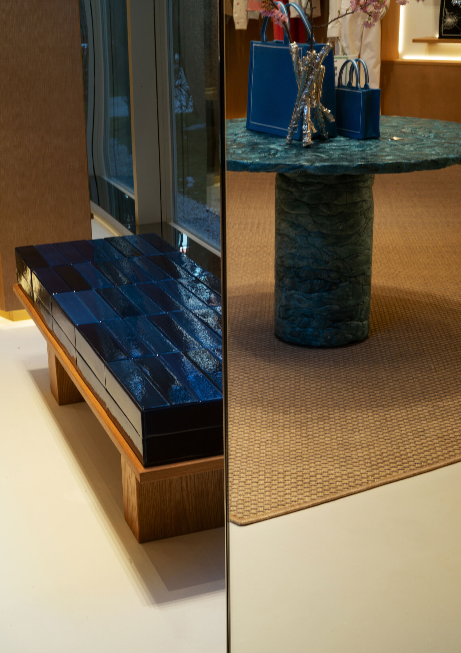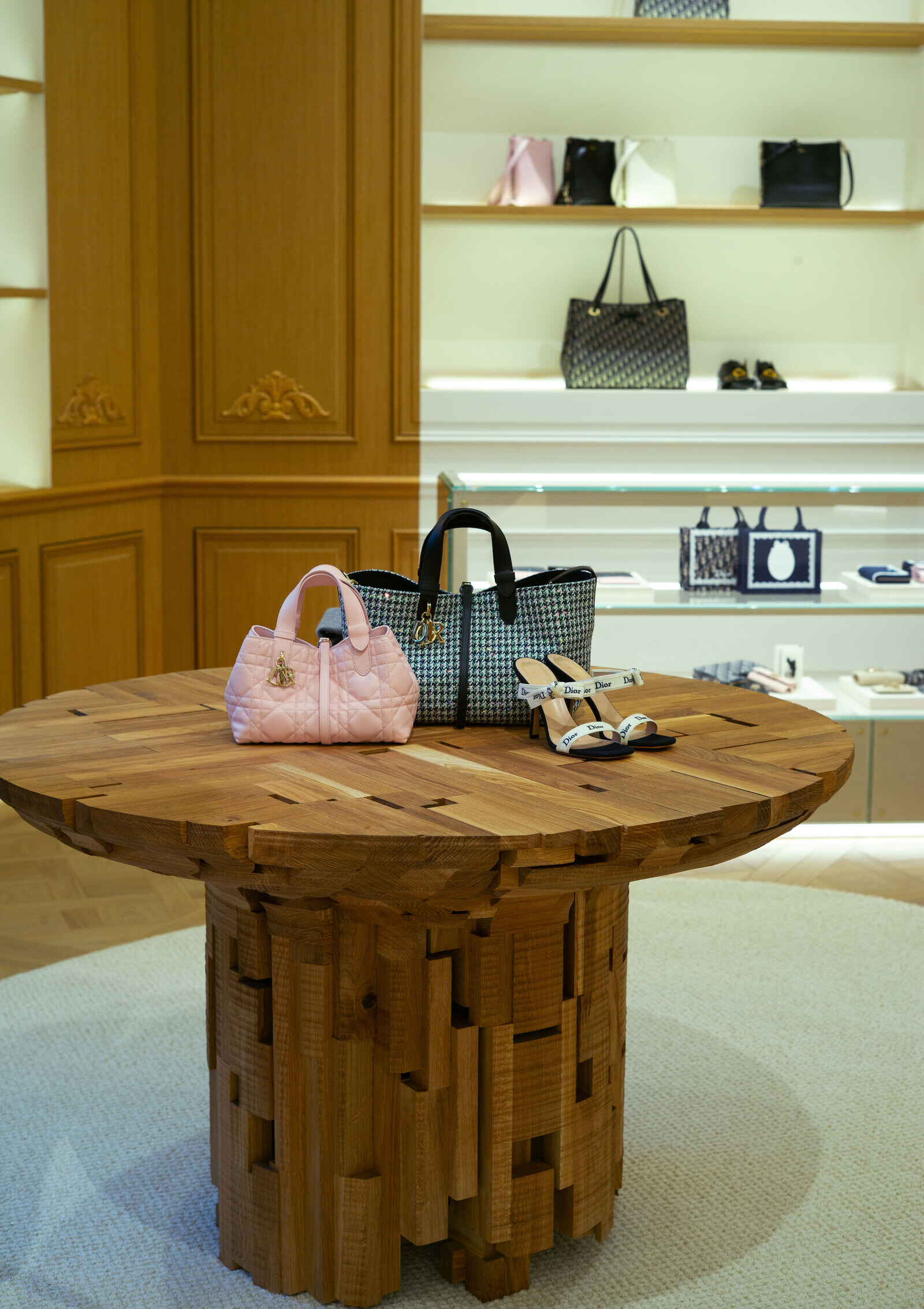 建築家・太田翔による組み木のテーブルと椅子が空間に温もりを添えるレザーグッズ ルーム。伝統的な木工技術を現代的なフォルムへと昇華した家具は、プロダクトでありながらアート作品としての存在感も併せ持っている。ディオールのレザーグッズと調和しながら、日本の職人技の精緻さをさりげなく伝える設えだ。