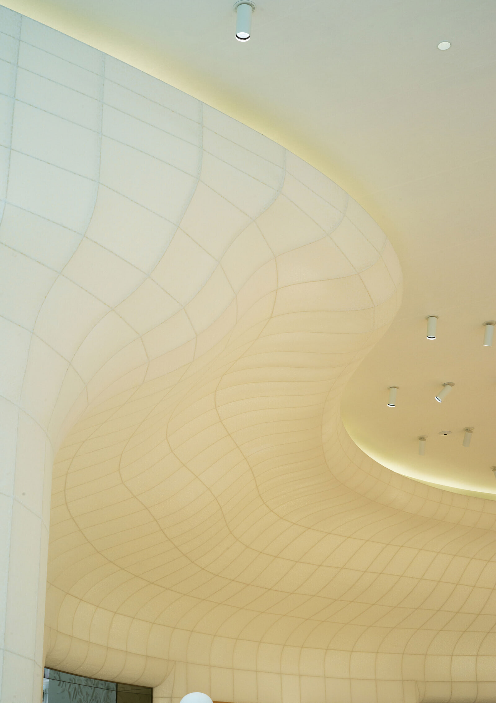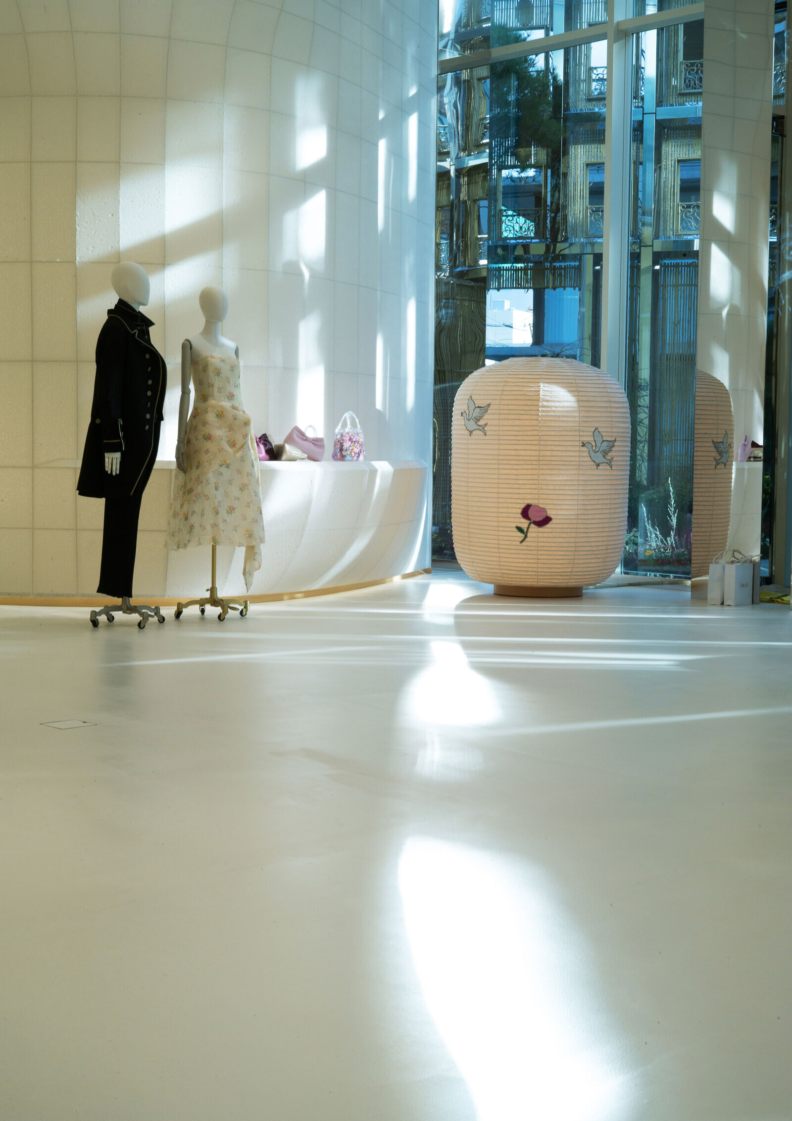 セントラル スペースを取り囲む内装には和紙が用いられ、柔らかな光を透過することで空間に繊細な陰影をもたらす。壁や天井に施された和紙は、日本のクラフトマンシップとディオールのエレガンスを結びつける重要な要素であり、繊維の質感そのものが装飾のアクセントに。