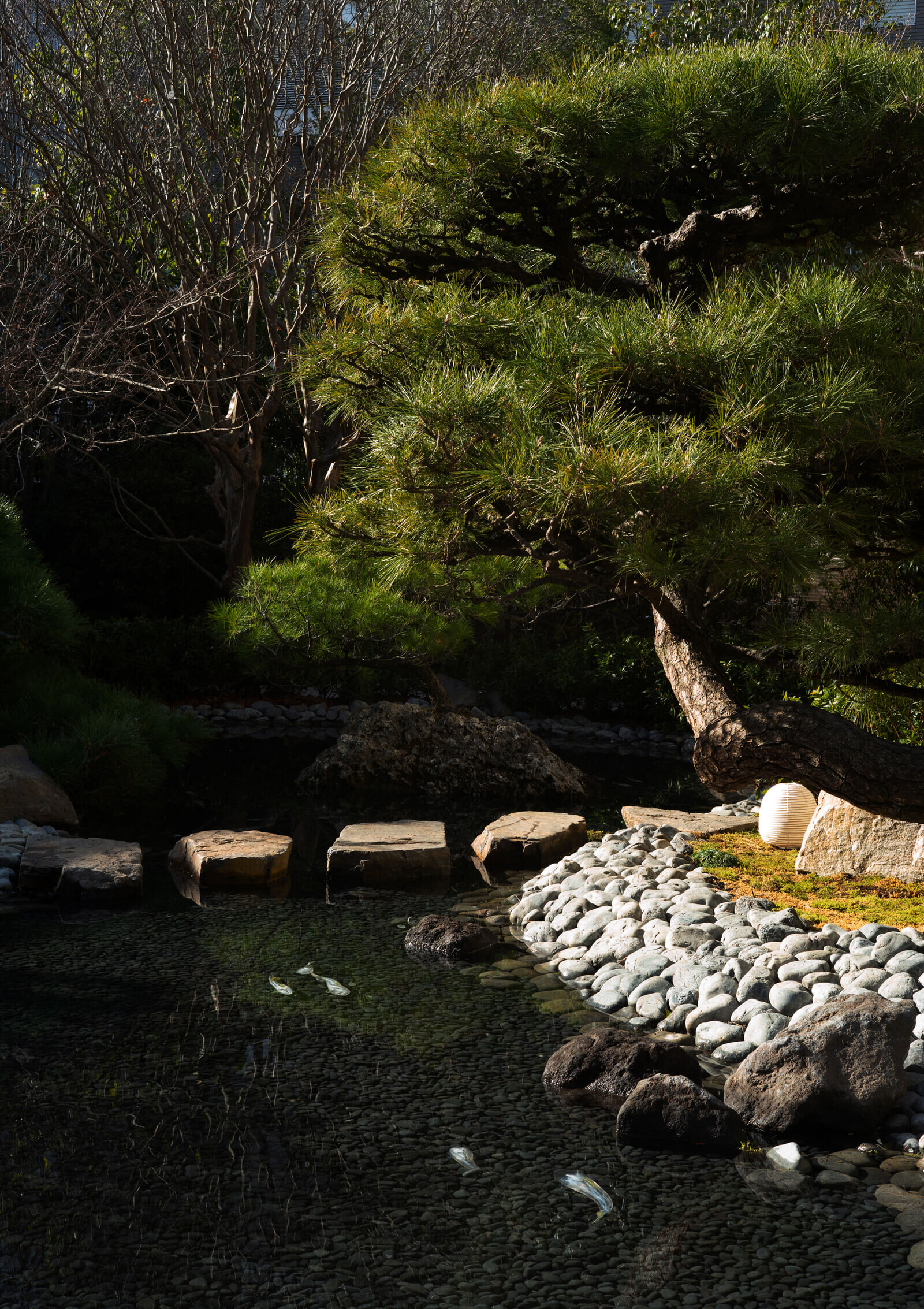 敷地内の池には、ガラスの鯉のインスタレーションも配されている。水面に浮かぶその鯉の姿は、時間帯や光の角度によって表情を変え、特に夜のライトアップ時には幻想的な光景を描き出す。