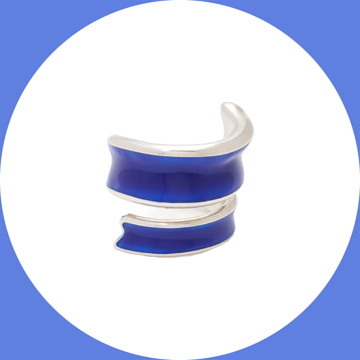 シルバートーンに深いブルーのエナメルをのせ、運気やエネルギーの流れを良くするとされるコイルモチーフを象ったボリュームのあるデザイン。端正な佇まいに知的さをも感じるリングで手元からパワーをチャージ。
