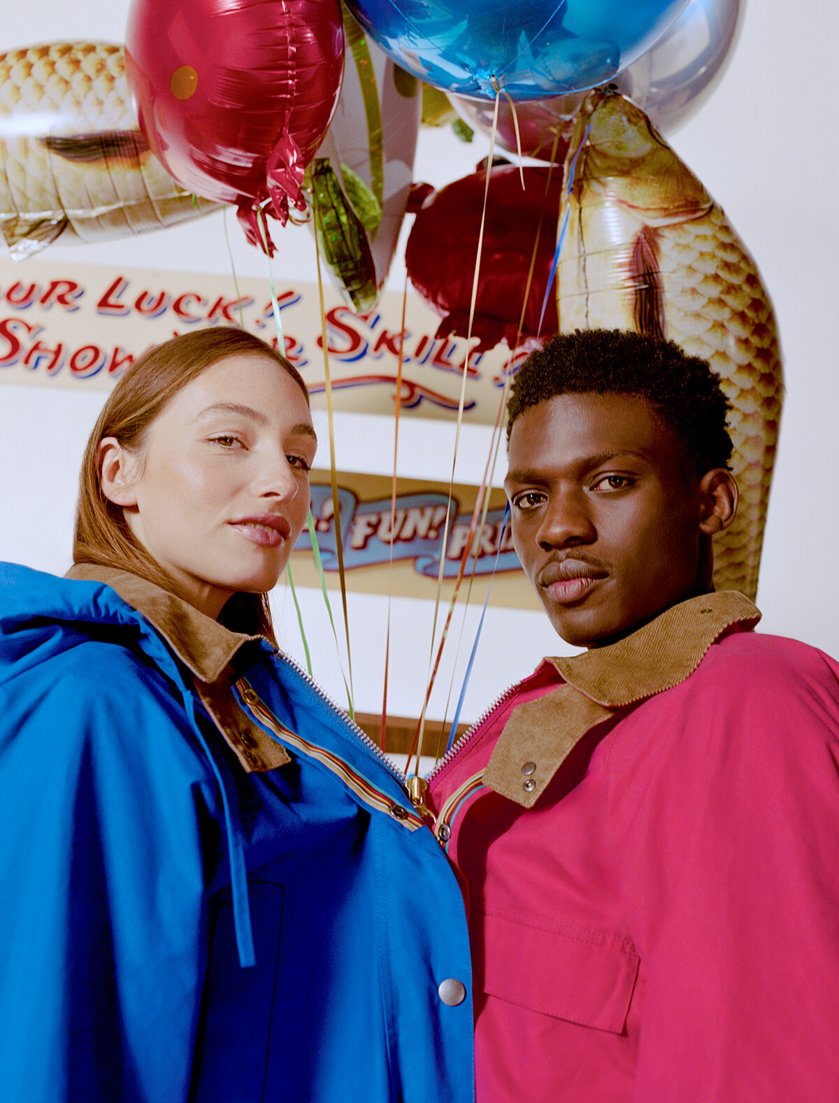 さらに、マス釣り用バッグから着想を得た新作サマーバッグや、フライフィッシングの刺繍を施したバケットハットといったアクセサリーも充実。それらを彩るアクセントとして、浮きやストライプモチーフのユニークなピンバッジも用意。コレクションを通して、英国で親しまれてきたどこか懐かしい占いアイテム「Fortuna Fish(フォーチュン・フィッシュ)」がデザインされており、本コラボレーションに英国らしい遊び心を加えている。