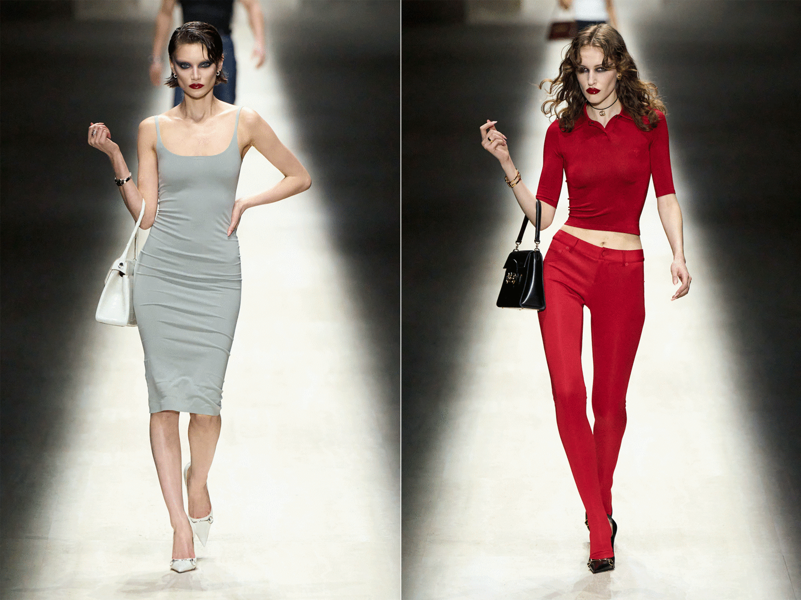 身体の曲線を極限まで強調する”ボディコンシャス”なシルエットーーーそれは、トム・フォード時代のグッチから着想を得たハイパーフェミニニティだ。デムナは、シームレスなシェイプウェアのような服で、シルエットをギリギリまでフィットさせ、挑発的でセクシーな魅力を再解釈したのだ。