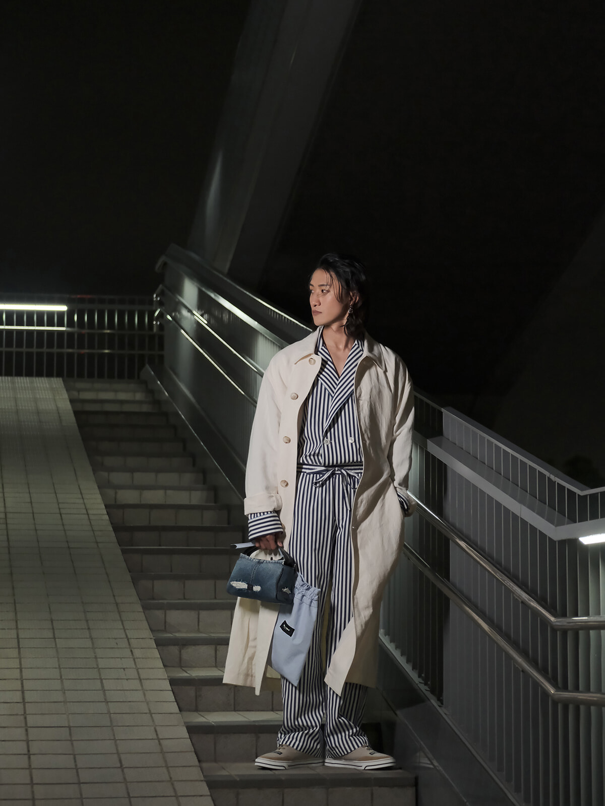 ミラノに出発する際のエアポートスタイルもキャッチ。ドルチェ&ガッバーナの新作ウェアとショルダーバッグを着用し登場。