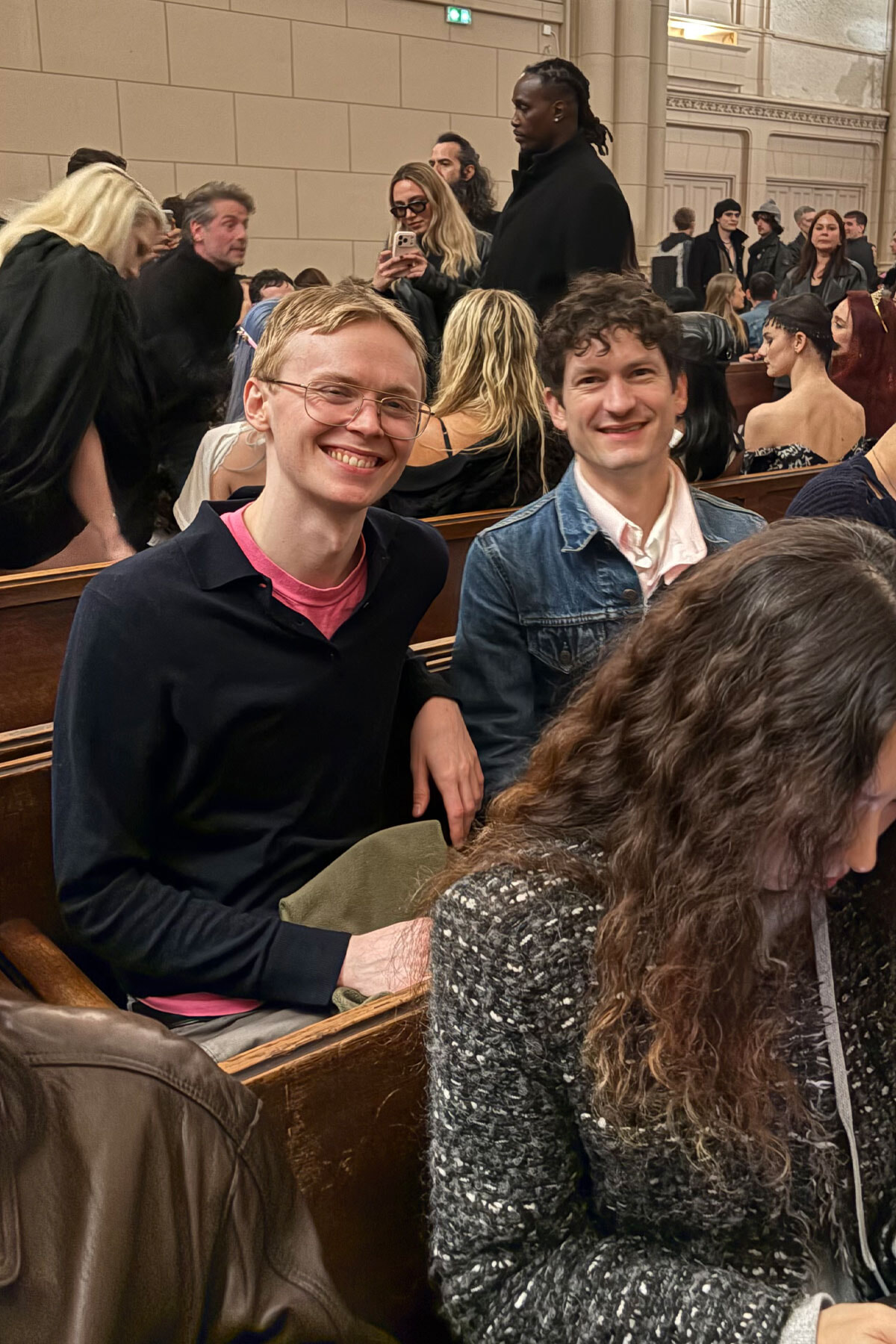 ヴァケラのショーの客席では、昨年のLVMHプライズのファイナリスト、オーガスト バロンのデザイナー二人組を見つけた。東京でお茶をしたこともある顔見知りなのだが、容易に移動できないタイプの席だったため服が全然わからないただの記念写真になってしまった。いつもかわいい格好をしています……。