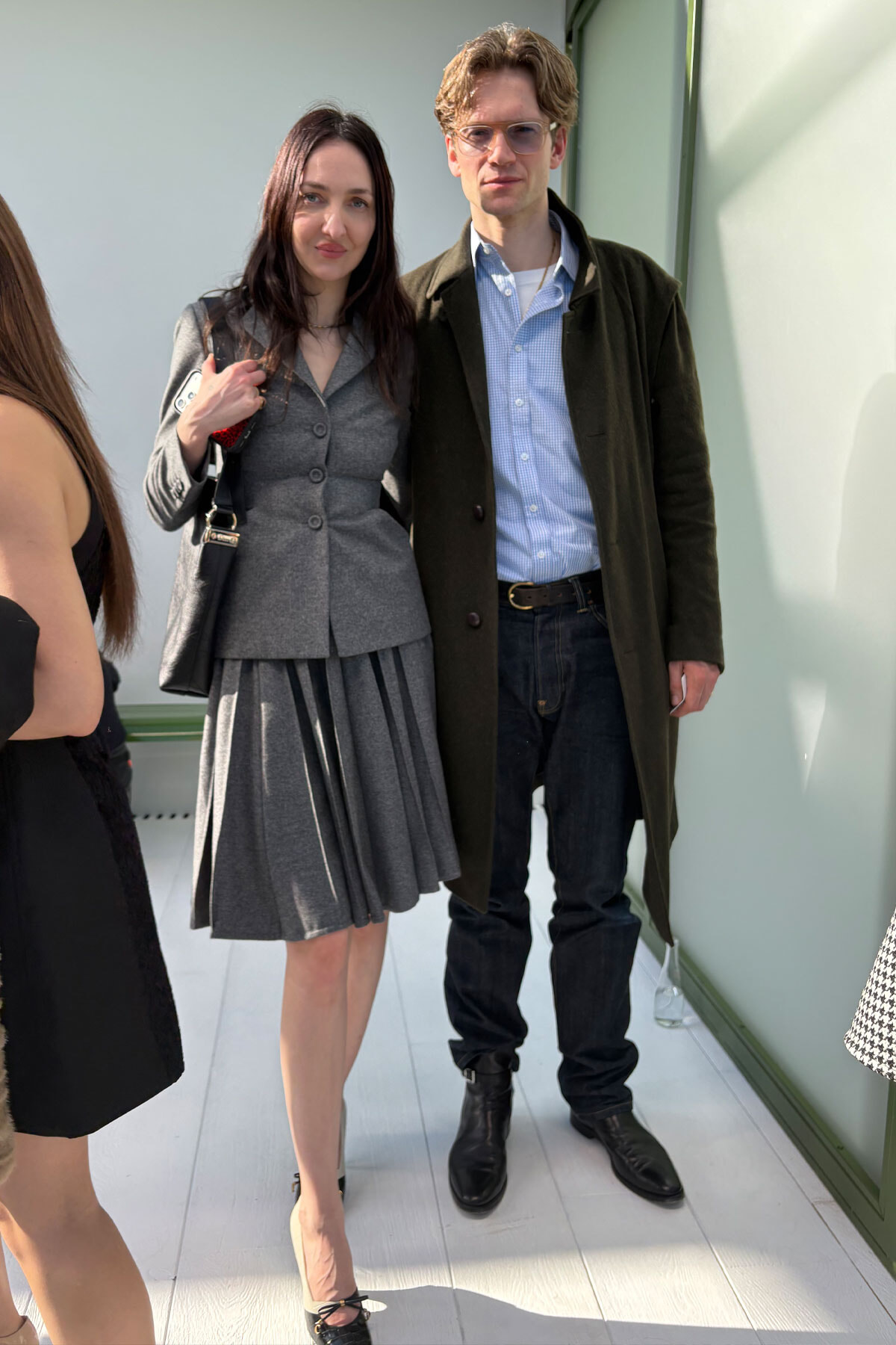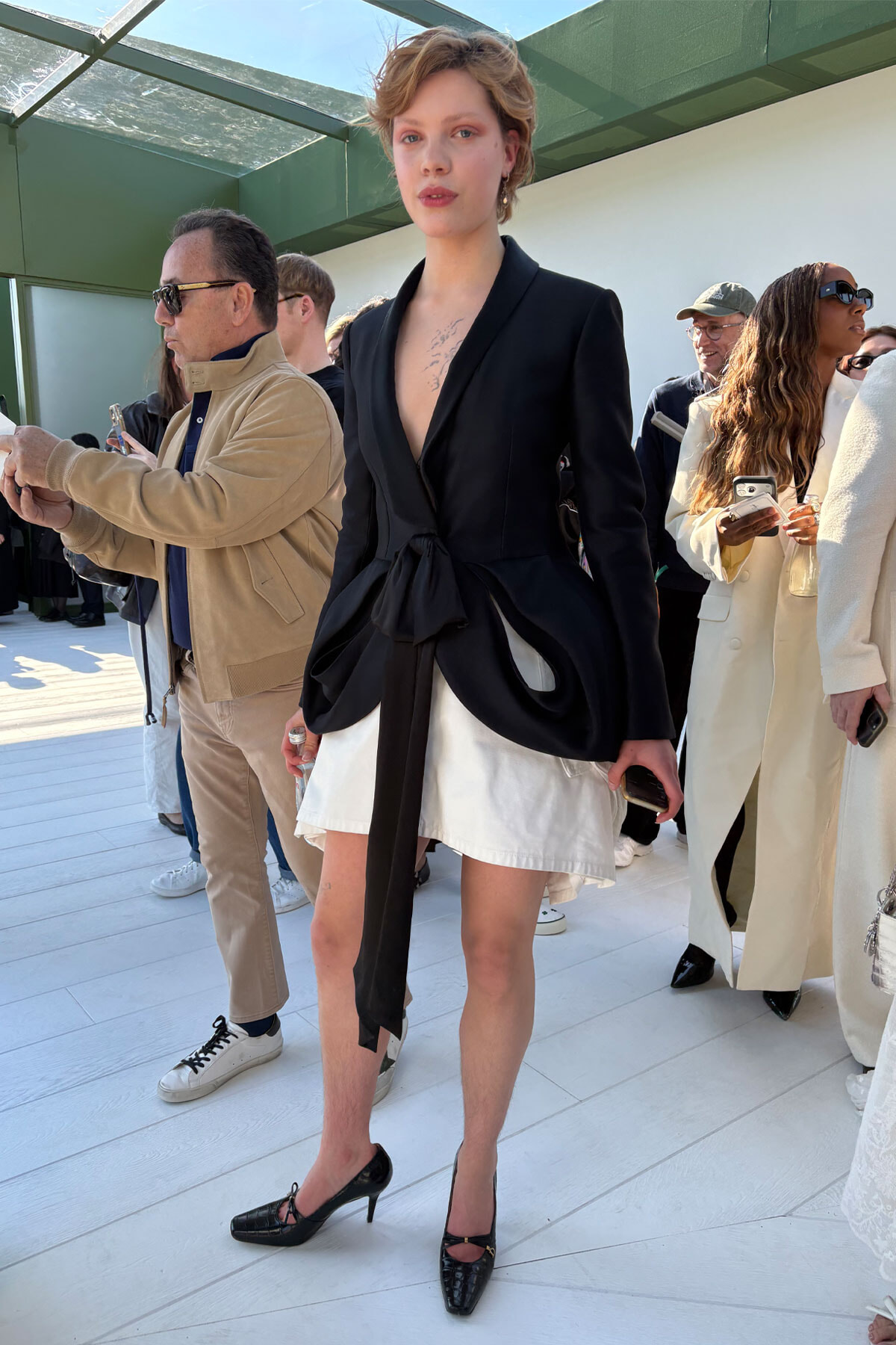 同じくディオールにて、「あなたのジャケット素敵ね!どこの?」と声をかけられたついでに写真を撮らせてもらったら、Elke Biesendorferという女優さんだった。胸元からちらりと見えるタトゥーを効かせつつ、2026年春夏のキールックをさらりと着こなしている。ジョナサン・アンダーソンが描く世界観にぴったりのムードをお持ちだった。