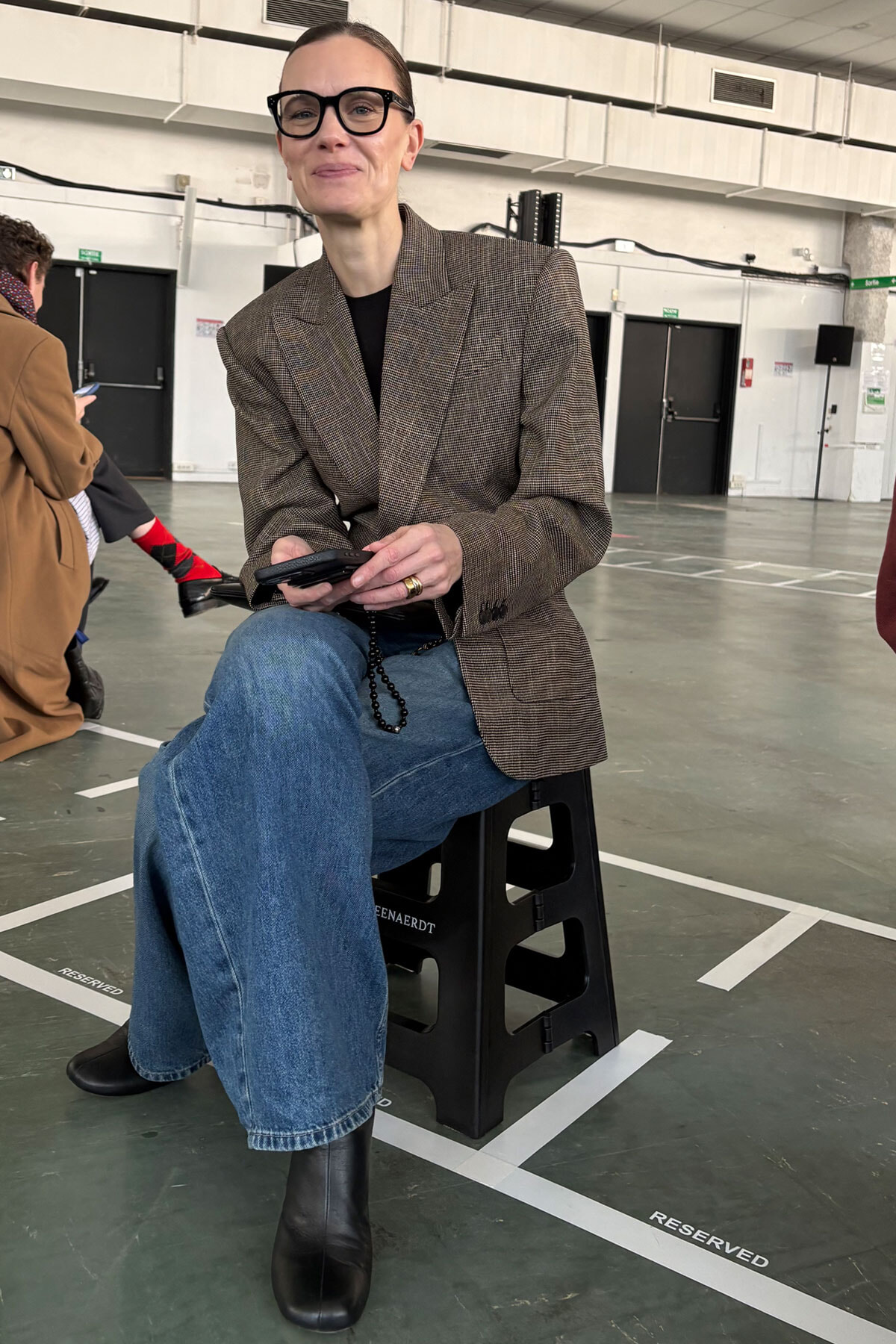 若手ブランドのマリー アダム リーナールトの会場には、前回紹介したエディターのジョー・エリソンが。奇しくもこの日もジーンズ。フィービー ファイロのウエストを絞ったデザインのジャケットがとっても似合っていた。