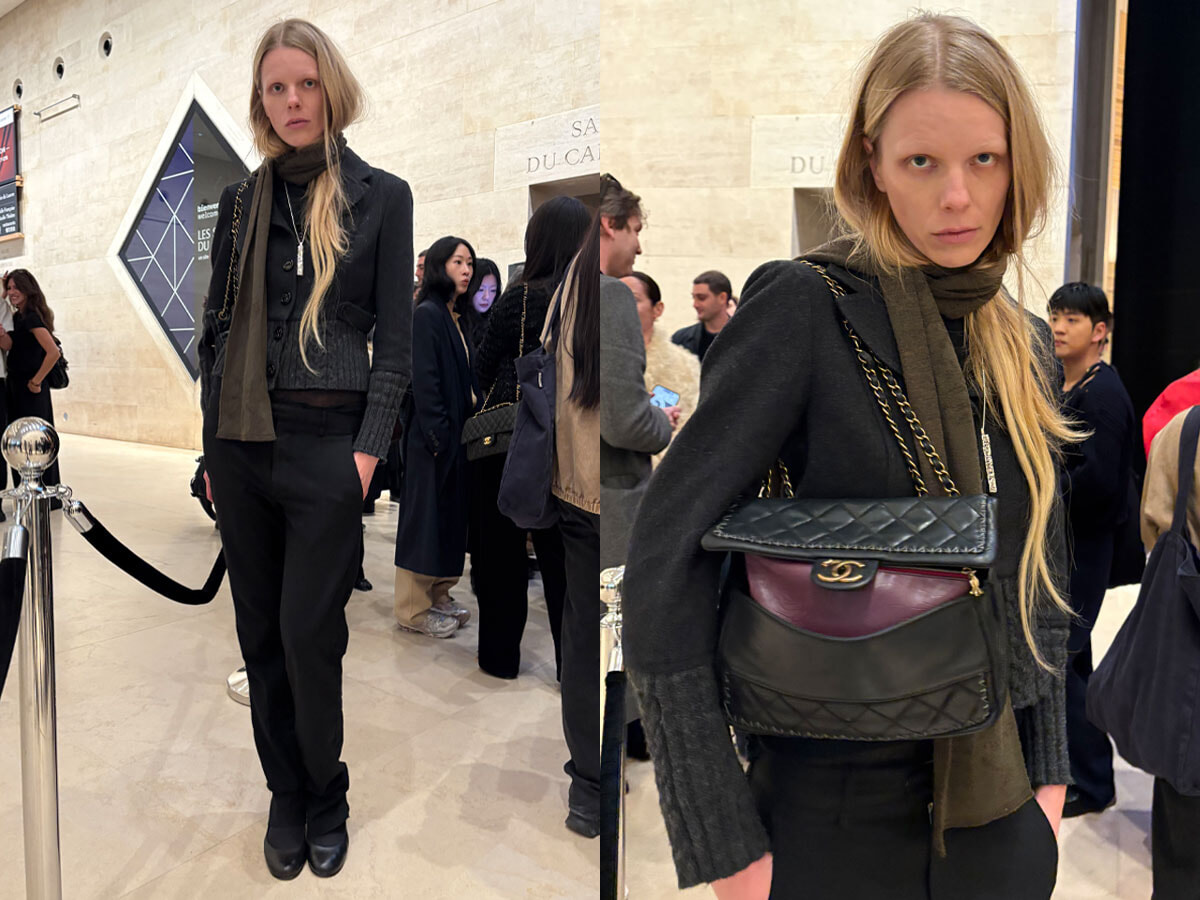 今季もシュールなコレクションだったホダコヴァの開場を待っていたら、シンプルなスタイリングにも関わらず目を引く姿が。レディーガガが手がけるコスメブランド「Haus Labs」の責任者を務めているKatharina Korbjuhnという方で、眉なしのメイクと共に、開けっぱなしにしたシャネルのバッグの持ち方に釘付けになってしまった。