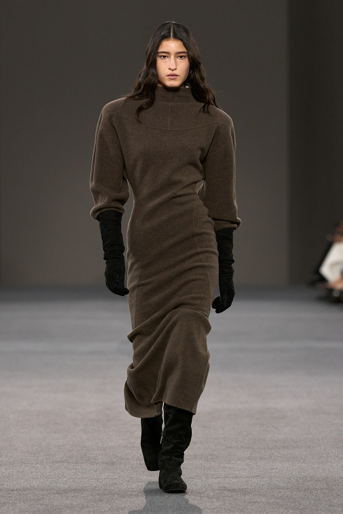 構築的なショルダー、ワイドスリーブのコート、籠手のようなスエードのロンググローブが、静かな緊張感を演出する。