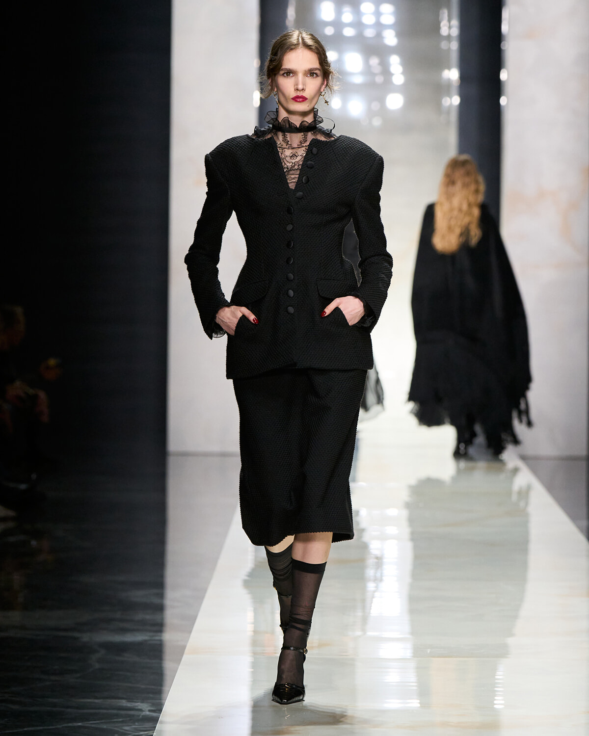 今シーズンはメゾンの原点に立ち返り、初期のアティテュードを象徴するシチリアンテーラードの存在を示した。メゾンのシグネチャーであるアワーグラスシルエットのジャケットやコートは、前後を同じ構造に仕立てる大胆なアプローチで刷新。同じカット、同じラペル、同じボタンの連なりを背面にも配した構造によって前後の境界を曖昧に表現したのだ。