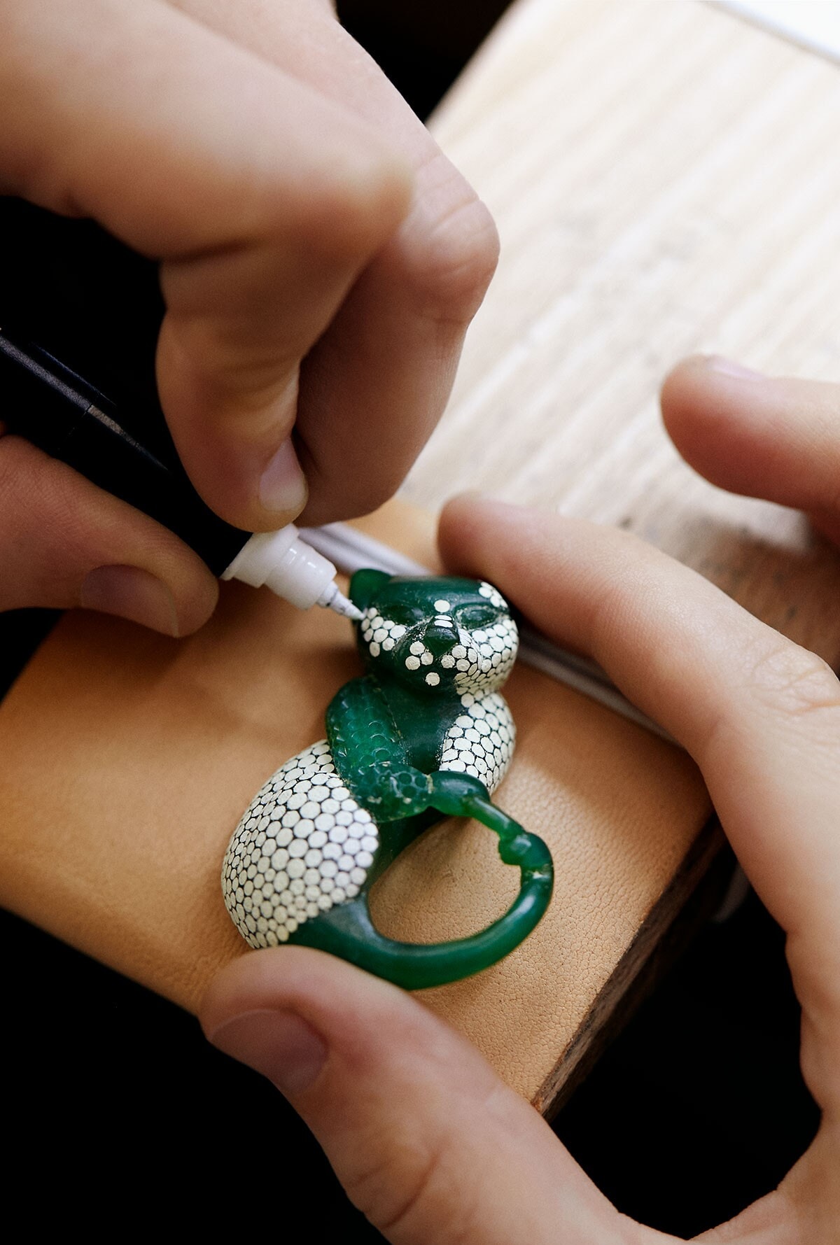 「まずはカルティエの職人たちに継続的に教育を提供し続けること。毎年、150から200人の従業員がカルティエ ジュエリー インスティテュートで訓練を受け、総研修時間は4500時間に上ります。彫金、石留め、研磨、鋳造、宝石細工といった主なジュエリー制作の技術はもちろん、ワックス彫刻など希少な工芸技術の継承も行っています。さらに異なる技能を有する職人同士のコラボレーション……たとえばジュエリー職人が石留めの訓練を受けることで、ジュエリー制作の工程をよりよく把握できるようになるのです」