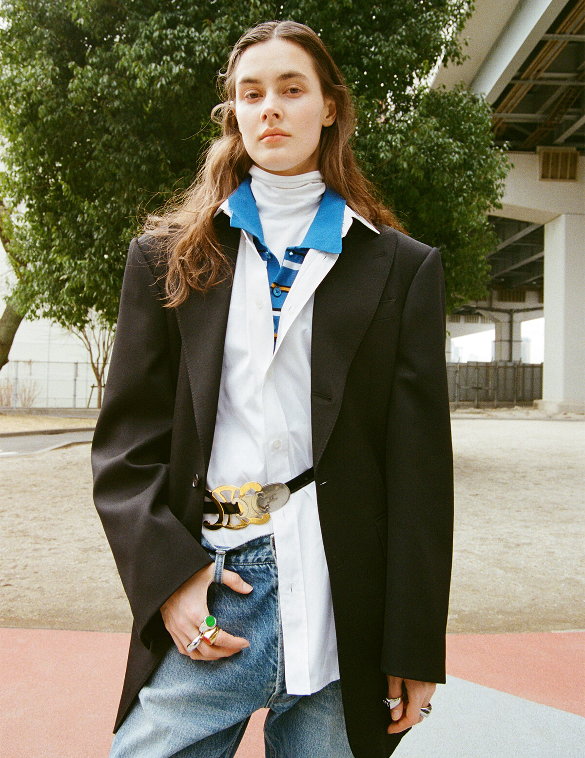 ジャケット¥451,000、シャツ¥170,500、中に着たポロシャツ¥159,500、ハイネックトップ¥115,500、パンツ¥159,500、ベルト¥434,500、リング(右手人指し指・上)¥74,800、リング(右手人指し指・下)¥74,800、リング(右手中指)¥83,600、リング(左手親指)¥86,900、リング(左手中指)¥74,800/以上セリーヌ(セリーヌ ジャパン)