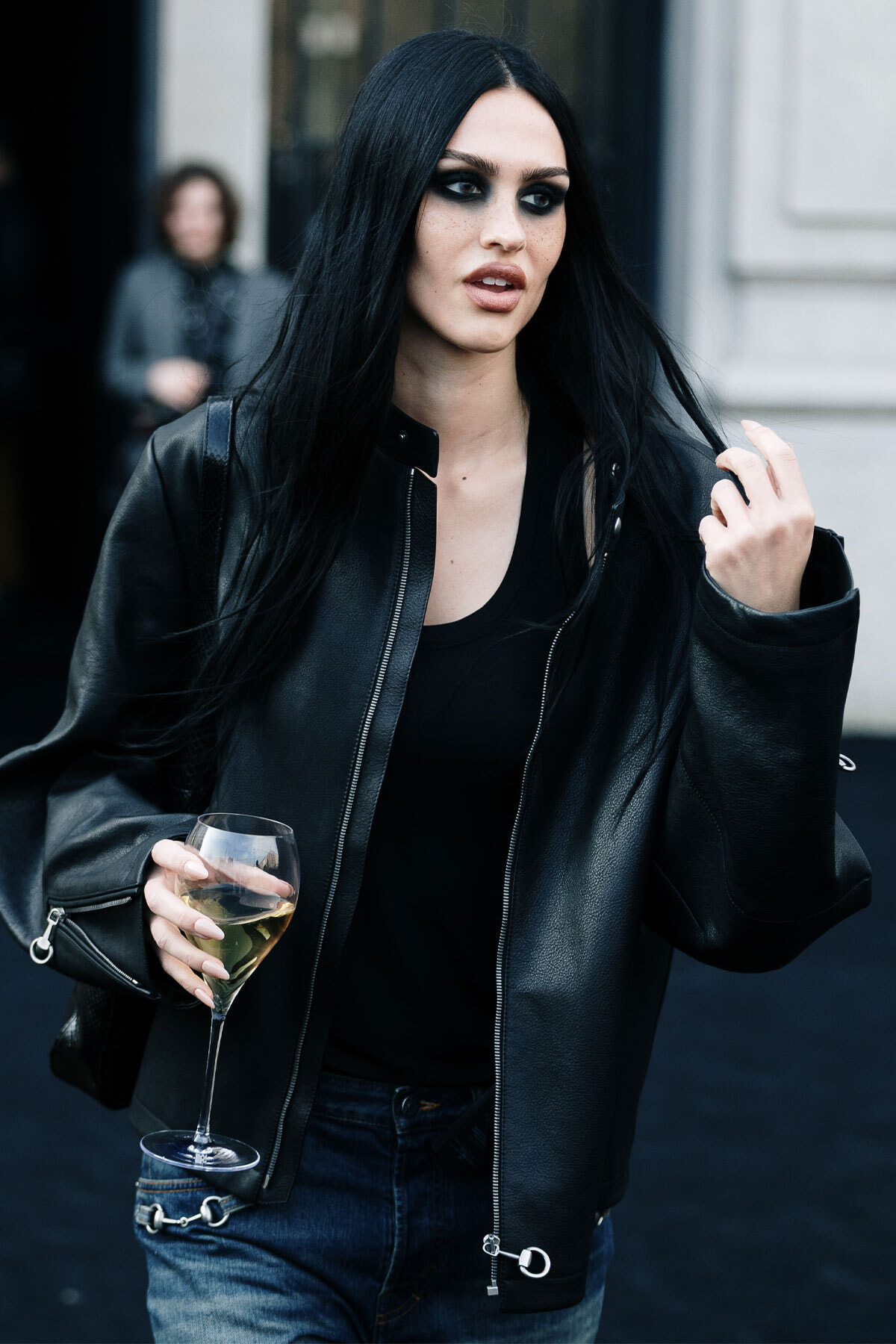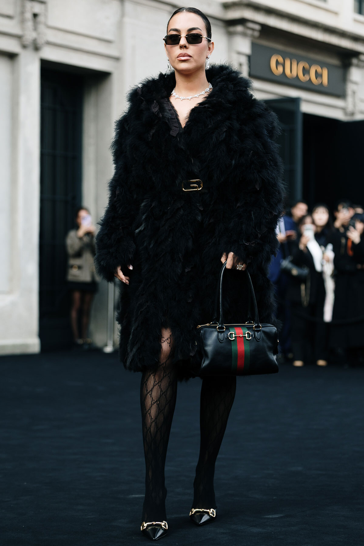 まずはNetflixのドキュメンタリー『私はジョージナ』(2024〜)でもおなじみの、サッカー選手、クリスティアーノ・ロナウドのパートナー、ジョージナ・ロドリゲス。マドリードのグッチで働いていた時にロナウドに見初められ、10年後、ショーのフロントローに降臨している。新生グッチは彼女のようなグラマラスな体型にもフィット。