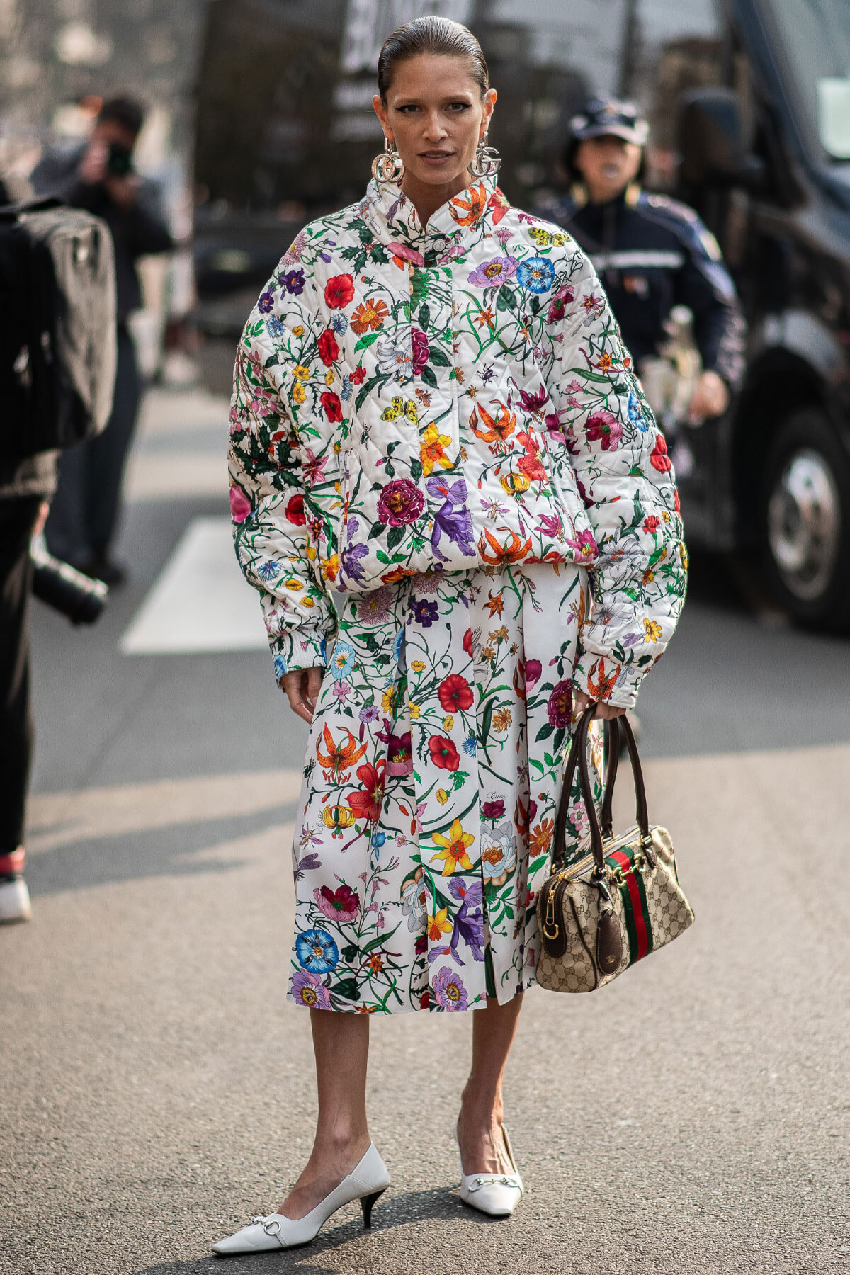 最後は全身グッチを纏ったゲストの方。フローラ プリント、ホースビット、ウェブ ストライプ、GGパターンとアイコンで埋め尽くされているのに新しく見えてしまうのは、素材使いやシルエットのせいなのか。薄眉のパンチのあるメイクも効いている。